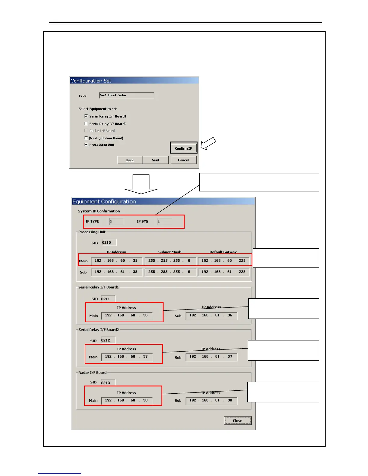 Radar I/F board can be confirmed when clicking Confirm IP by the Configulation Set dialog.