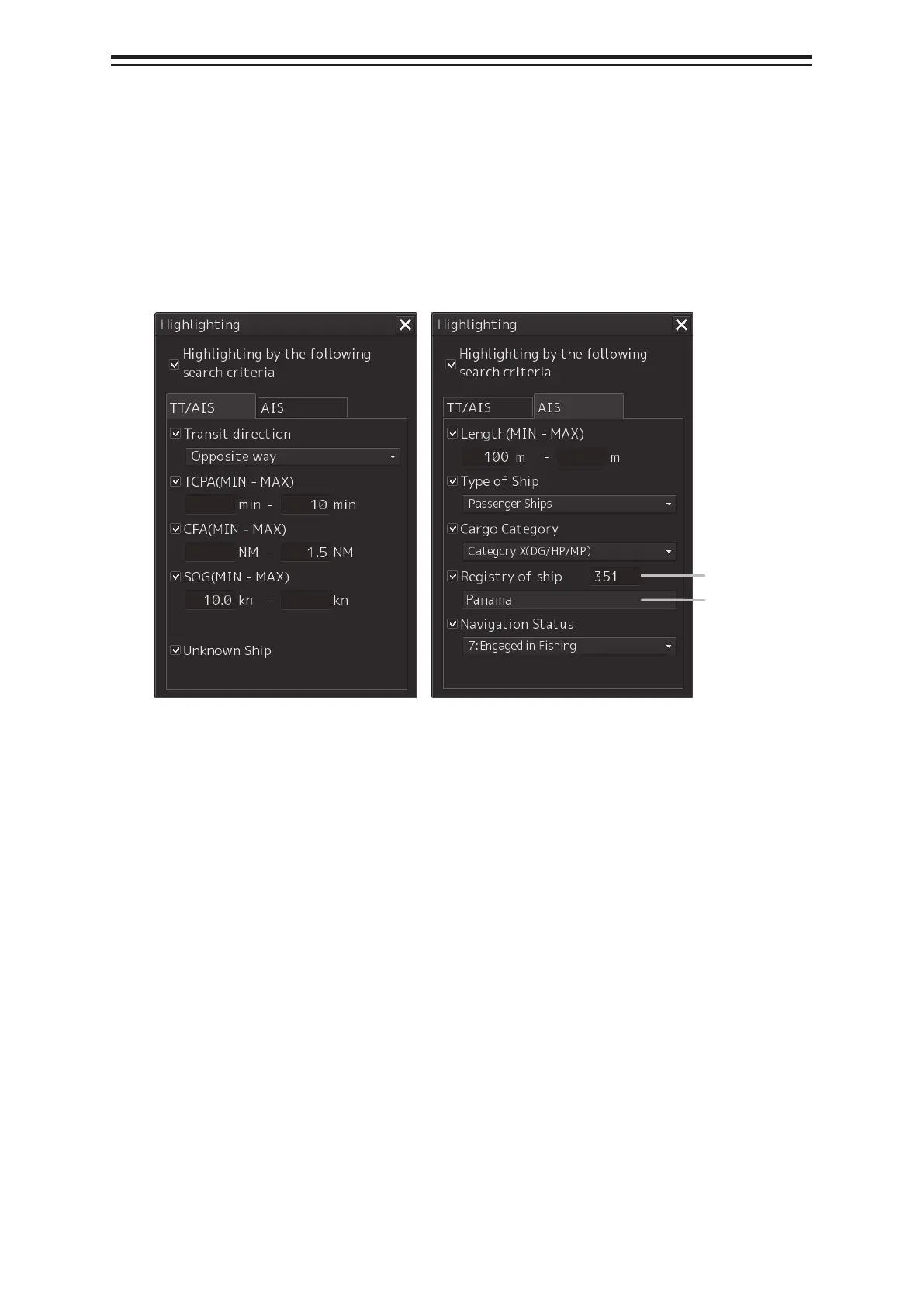 TT/AIS symbols can be searched by specifying criteria and highlight them.