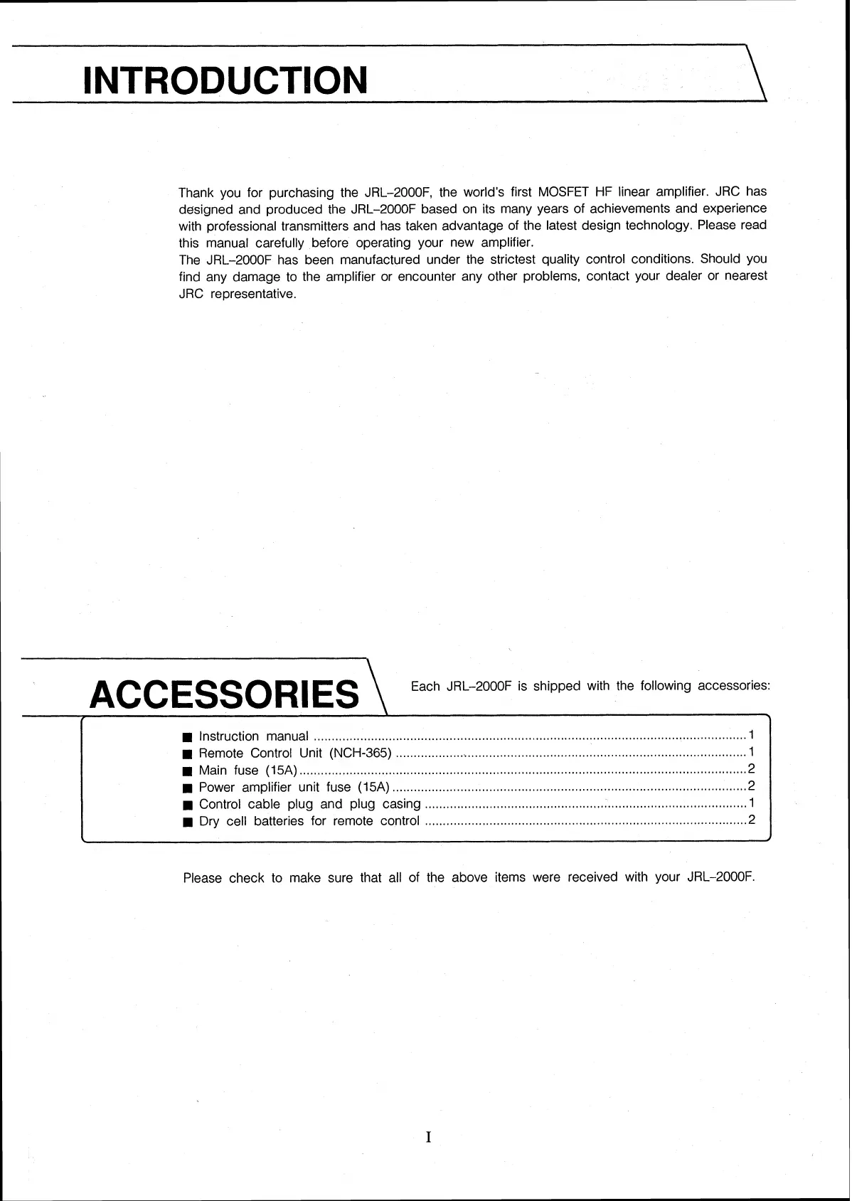 Thank you for purchasing the JRL-2000F, the world's first MOSFET HF linear amplifier. JRC has