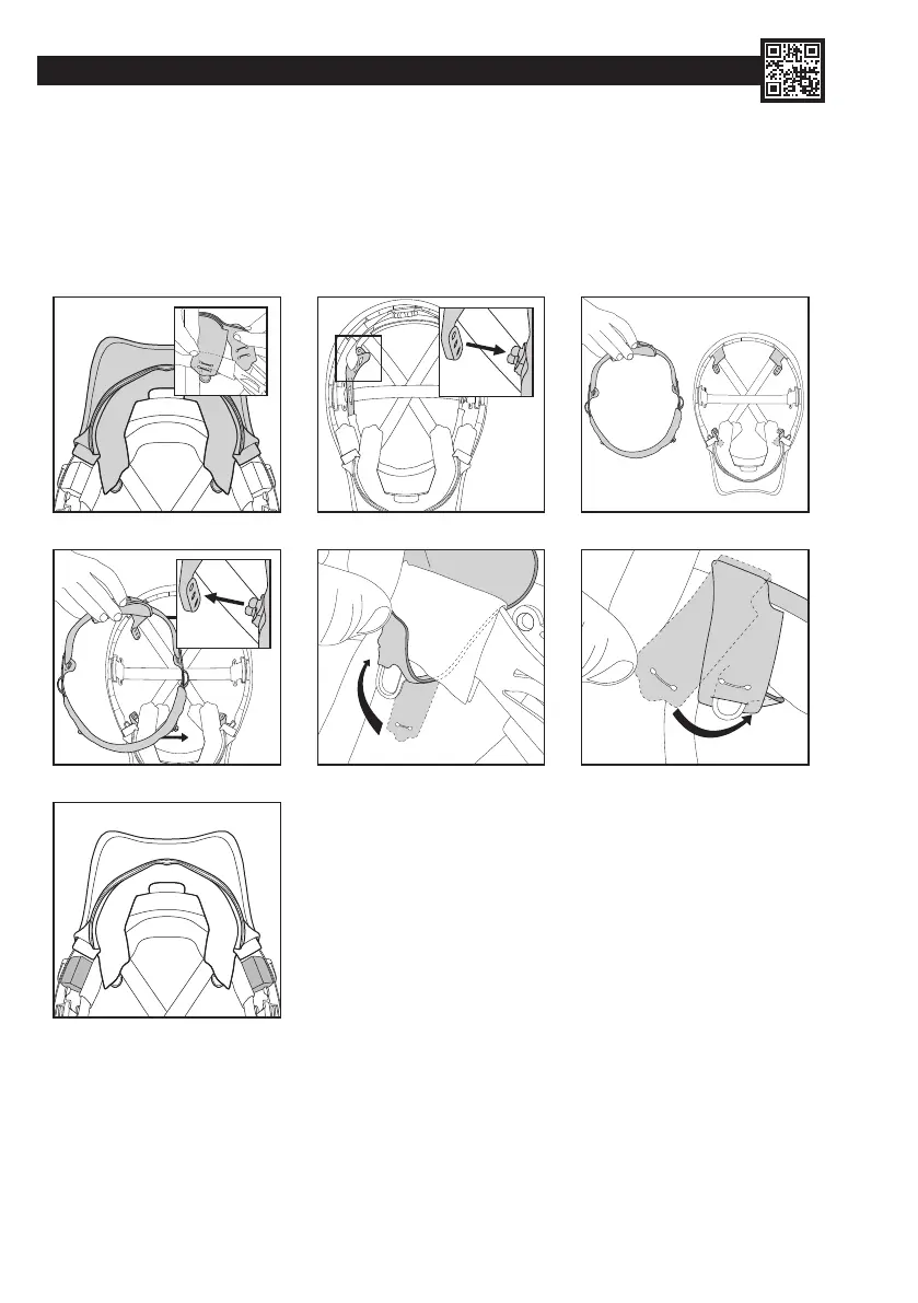 1. Løsne de re innvendige og utvendige ringene på ansiktstetningsskjørtet fra festepunktene for stroppen inni hjelmen.