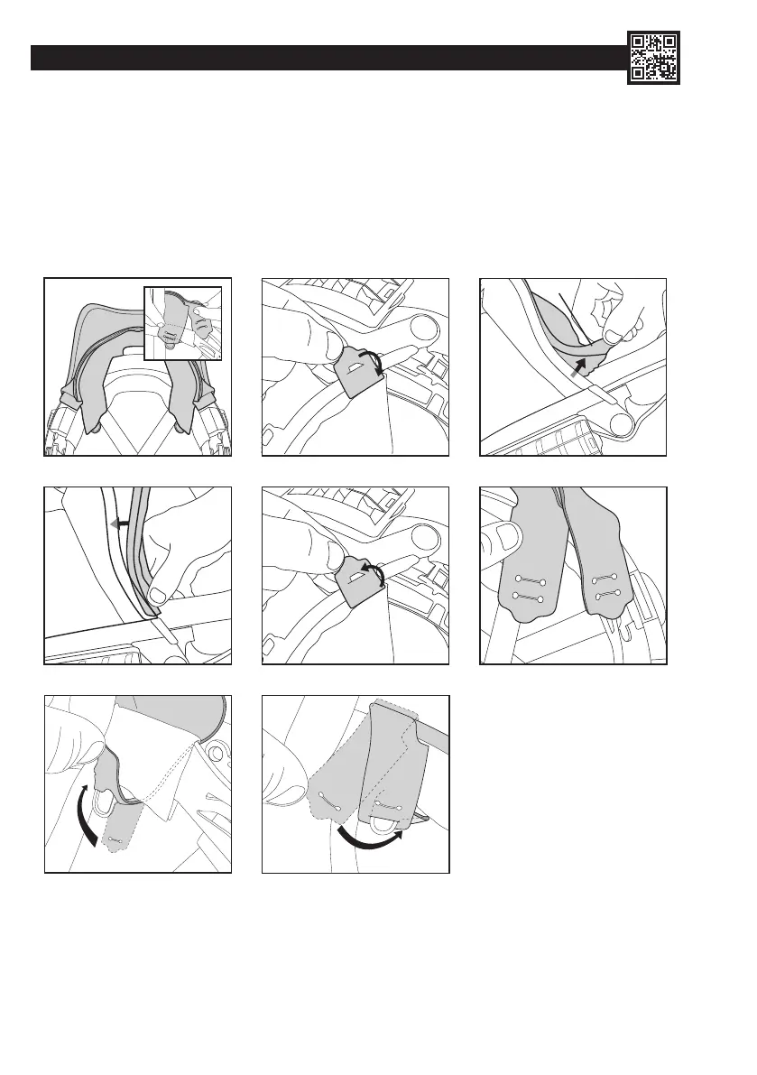 7. Feed the outer set of skirt loops behind the harness inside the helmet. Hook the loops over the harness mounting points inside the helmet.