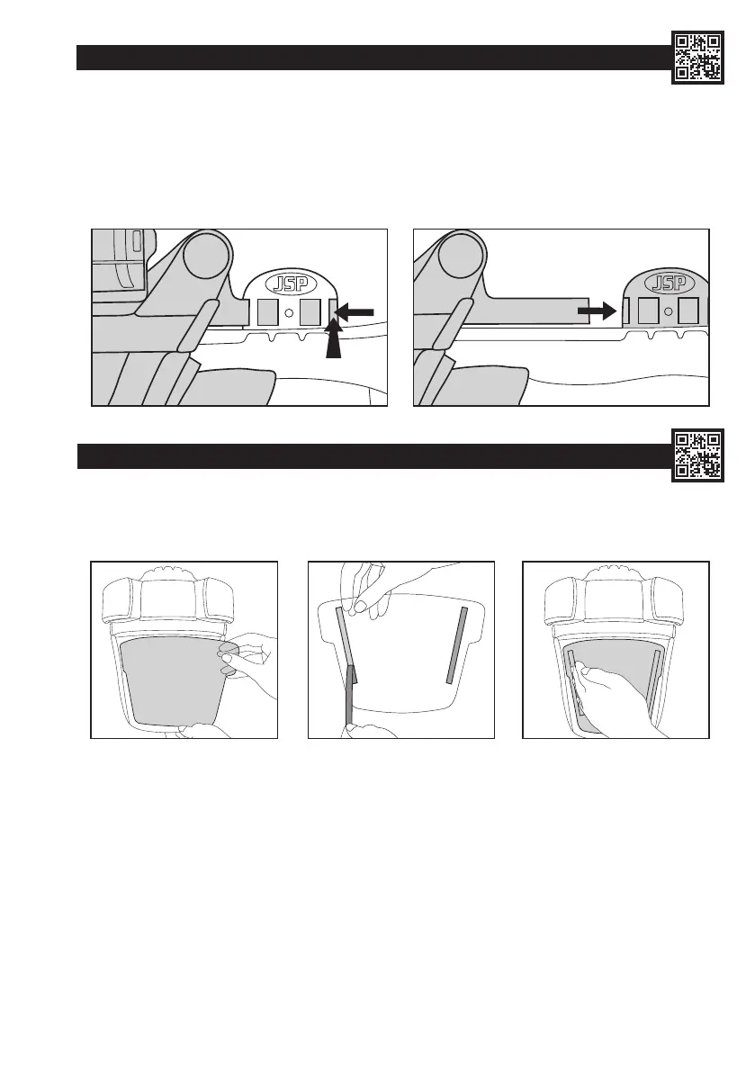 2. Käyttöyksikön ja visiirin pidikkeen voi vaihtaa liu'uttamalla visiirin sivuvarret takaisin visiirin pidikkeen sovitekappaleisiin kypärän kummallakin
