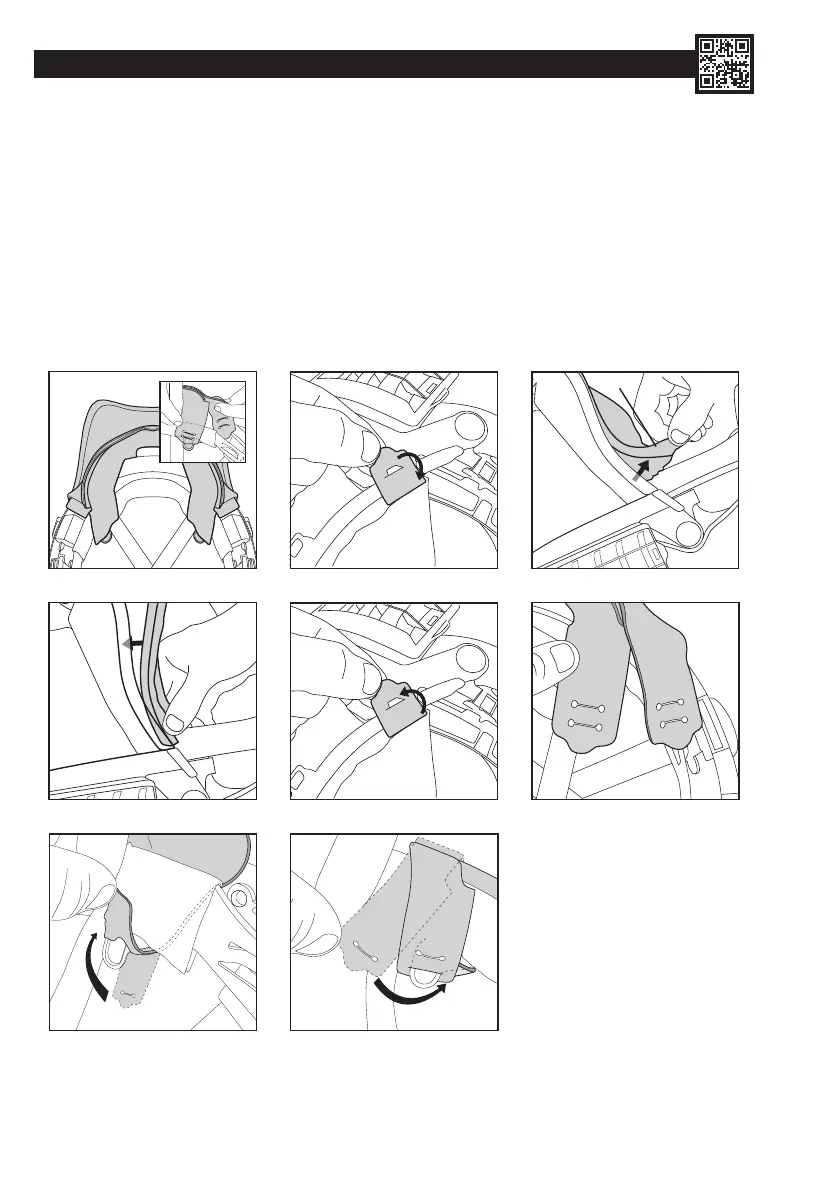 7. Introduzca las vueltas exteriores del contorno de sellado detrás del arnés, en el interior del casco. Enganche las vueltas en los puntos de