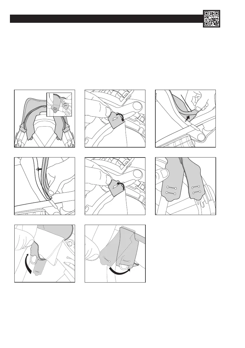 7. Vnější sadu oček protáhněte za popruhy uvnitř přilby. Očka zahákněte za upevňovací body uvnitř přilby.