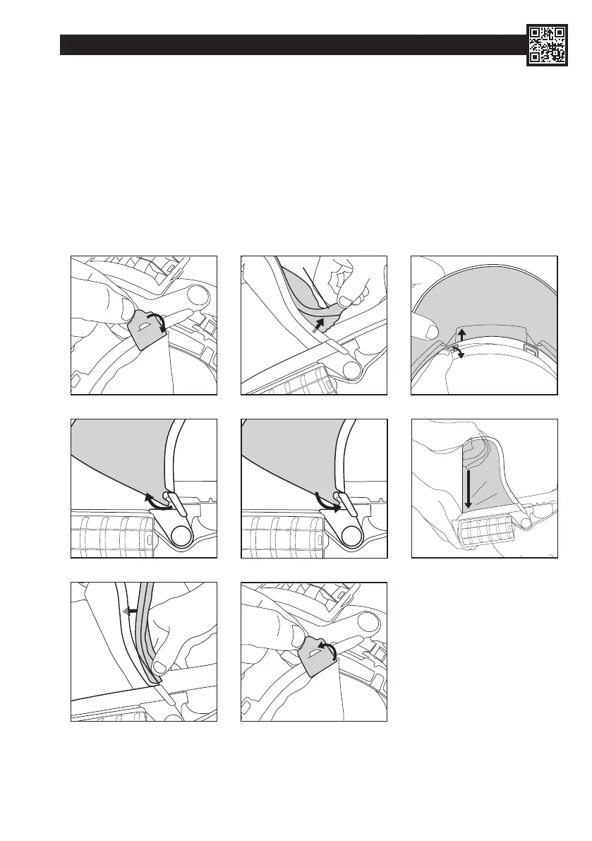 5. Fastgør visiret igen ved at fastgøre krogene i enderne af visiret til hjørnerne på visirets fastgørelseskanal. Understøt det sorte gummistop