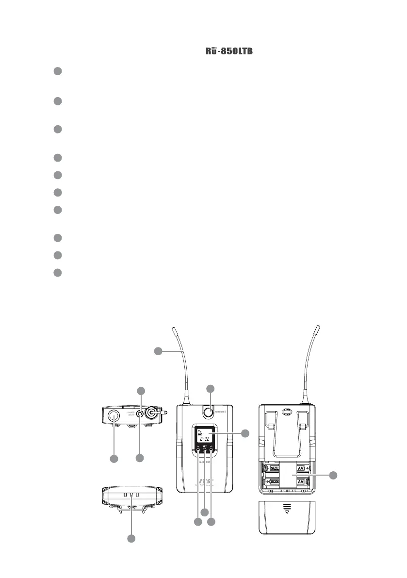 LED indicator: it shows the transmitter’s status, including battery level, mute