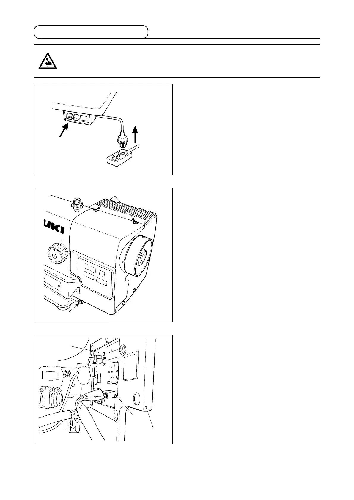 To prevent personal injuries caused by electric shock hazards or abrupt start of the sewing machine,