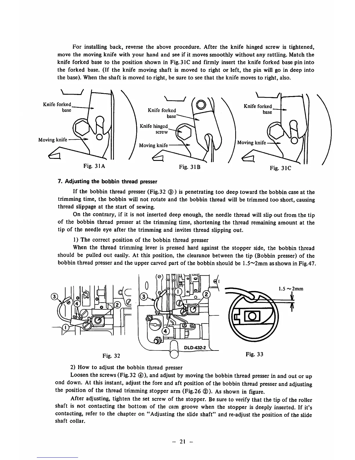 bobbin thread presser and the upper carved part of the bobbin should be 1.5~2mm asshown in Fig.47.
