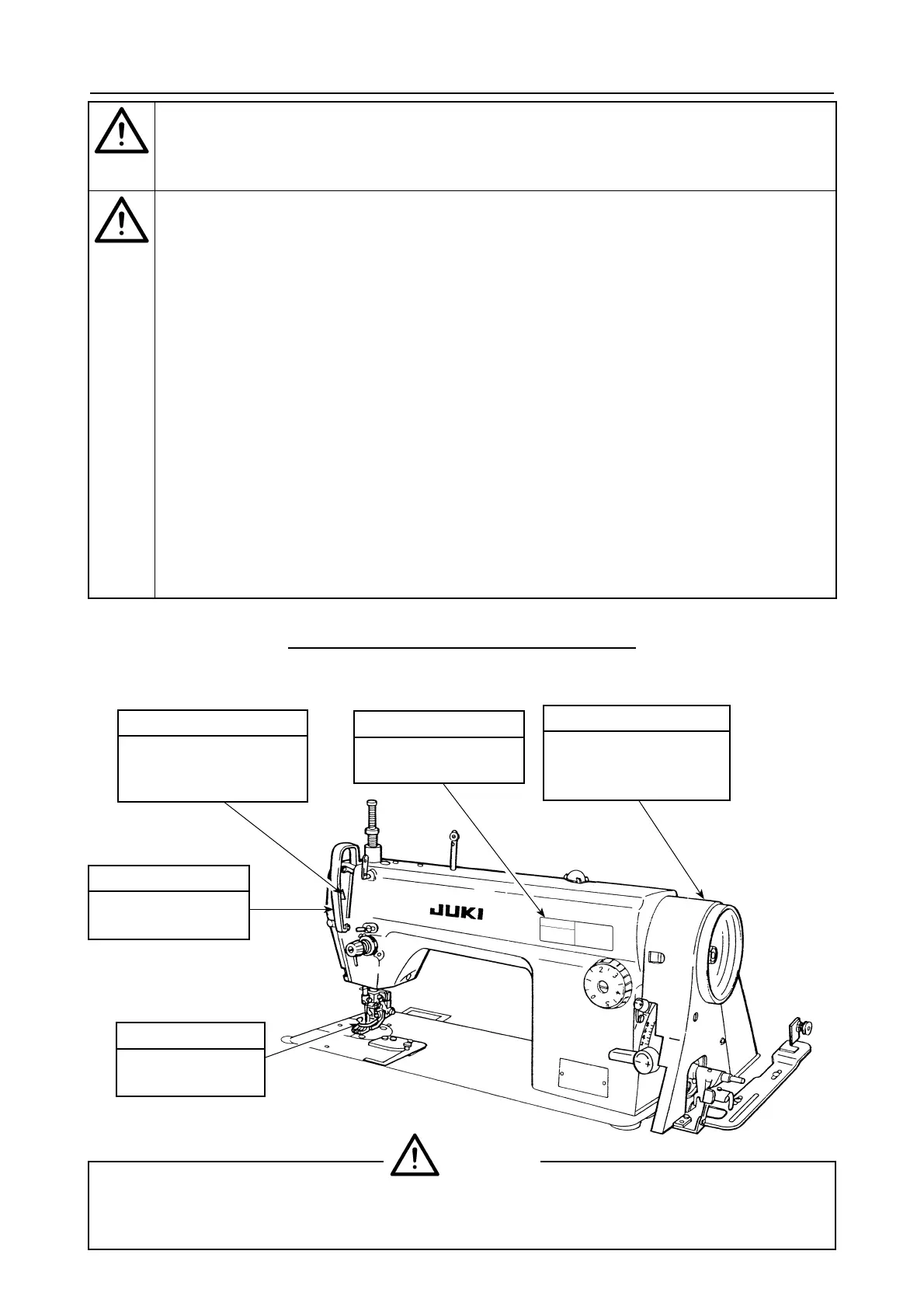 2. 巻き込みによる人身事故防止のため、ミシン運転中ははずみ車、V ベルト、モータ付近に指、