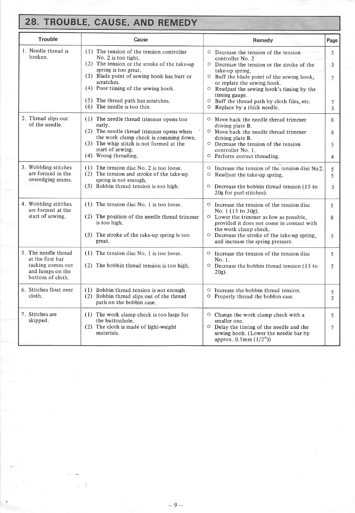 JUKI LBH-781 - Trouble, Cause, and Remedy (1); 1. Needle Thread is Broken; 2. Thread Slips Out of Needle; 3. Wobbling Stitches in Overedging Seams