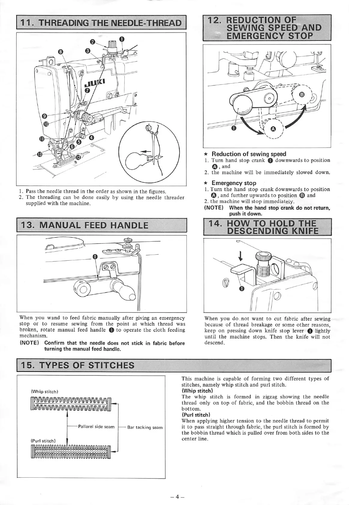 JUKI LBH-784 - Needle Threading; Speed Control and Emergency Stop; Sewing Speed Reduction Procedure; Emergency Machine Stop Procedure