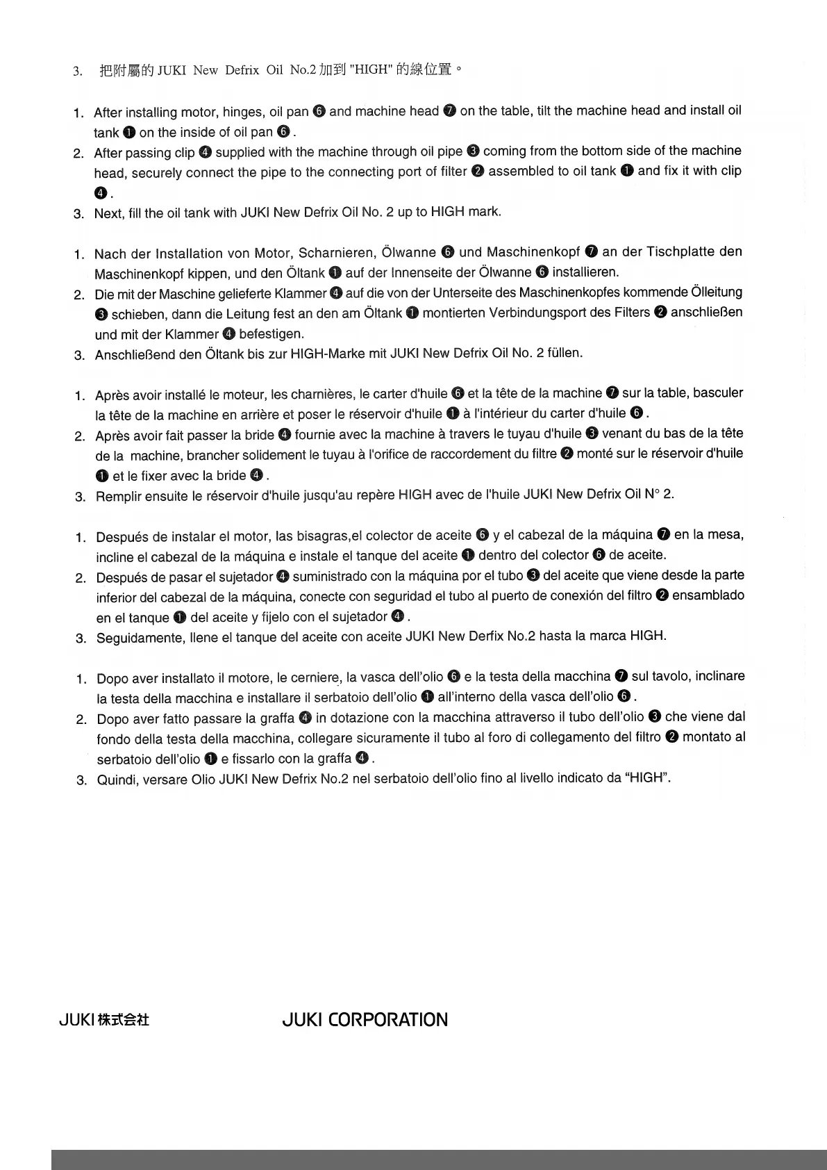 JUKI LU-1510-7 - Machine Setup and Oil Filling; Install Oil Tank; Connect Oil Pipe; Fill Oil Tank to HIGH Mark