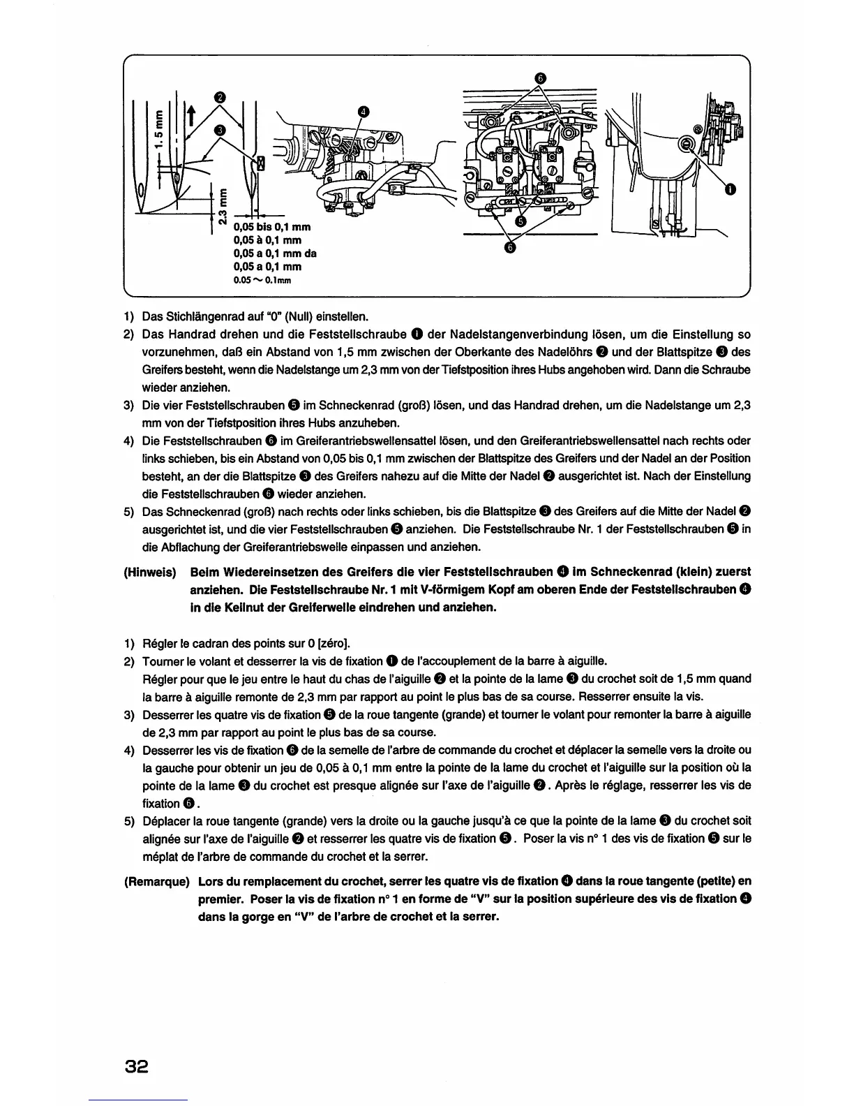 la gauche pour obtenir un jeu de 0,05 a 0,1 mm entre la pointe de la lame du crochet et I'aiguillesur la position ou la