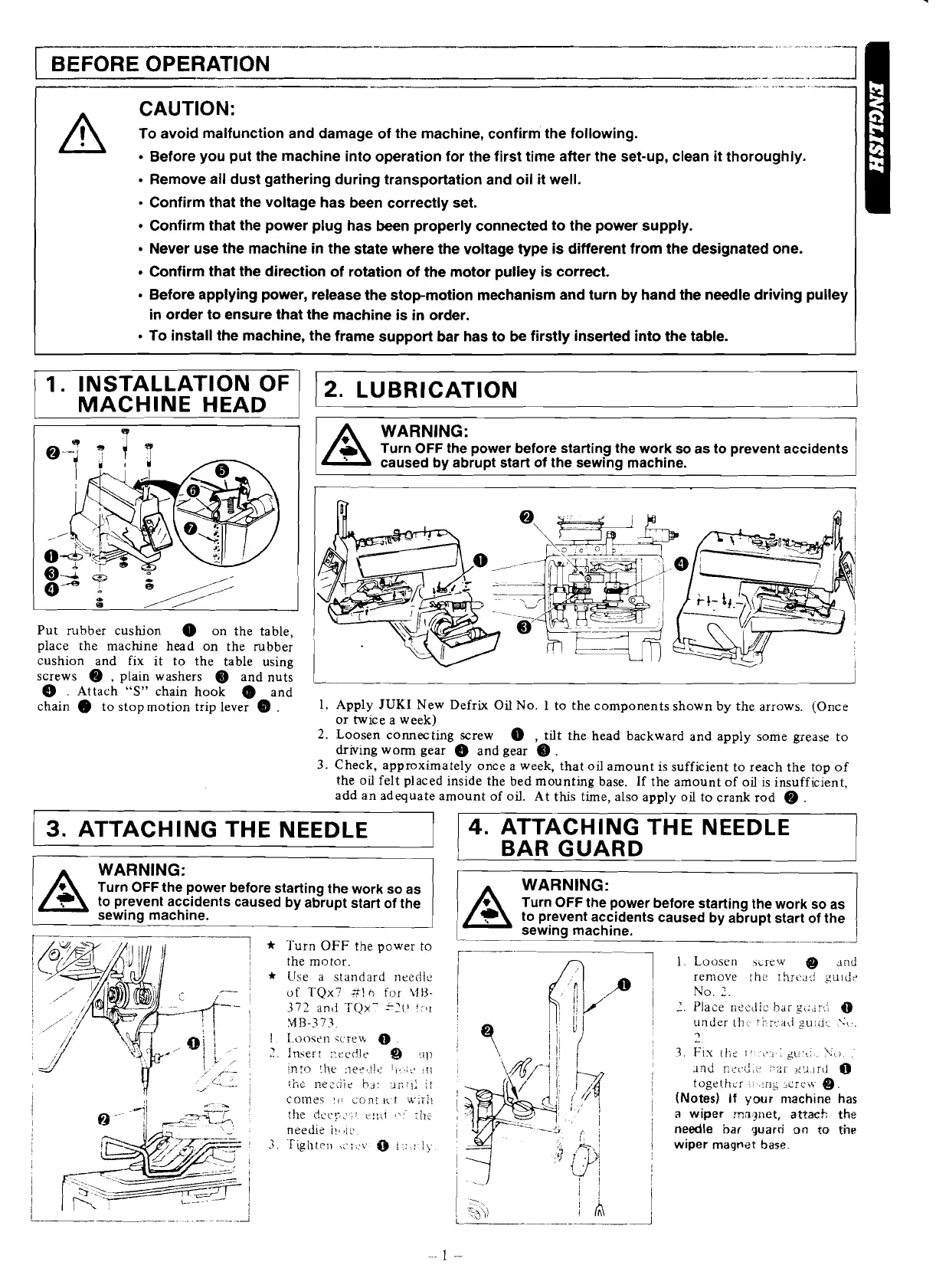 Before applying power, release the stop-motion mechanism and turn by hand the needle driving pulley