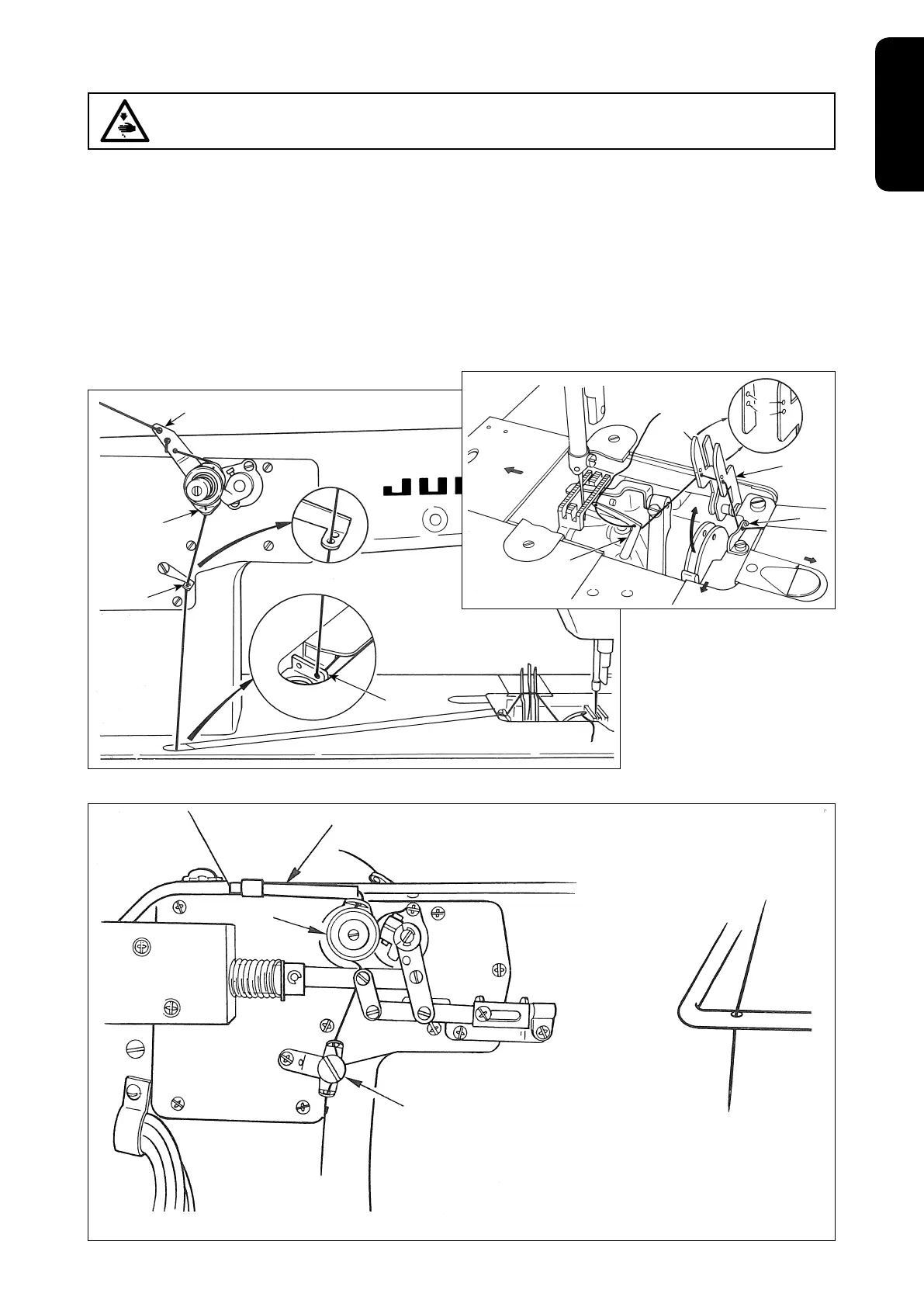1. Pass the looper thread through the looper thread guide plate as illustrated. When using a hard-twisted thread or