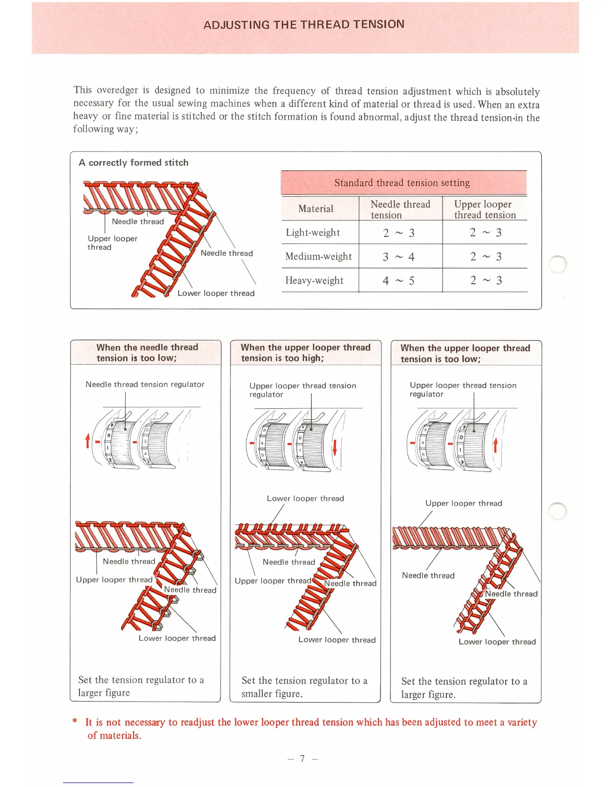 JUKI MO-103N - Adjusting the Thread Tension; Needle Thread Tension Too Low; Upper Looper Thread Tension Too High; Upper Looper Thread Tension Too Low