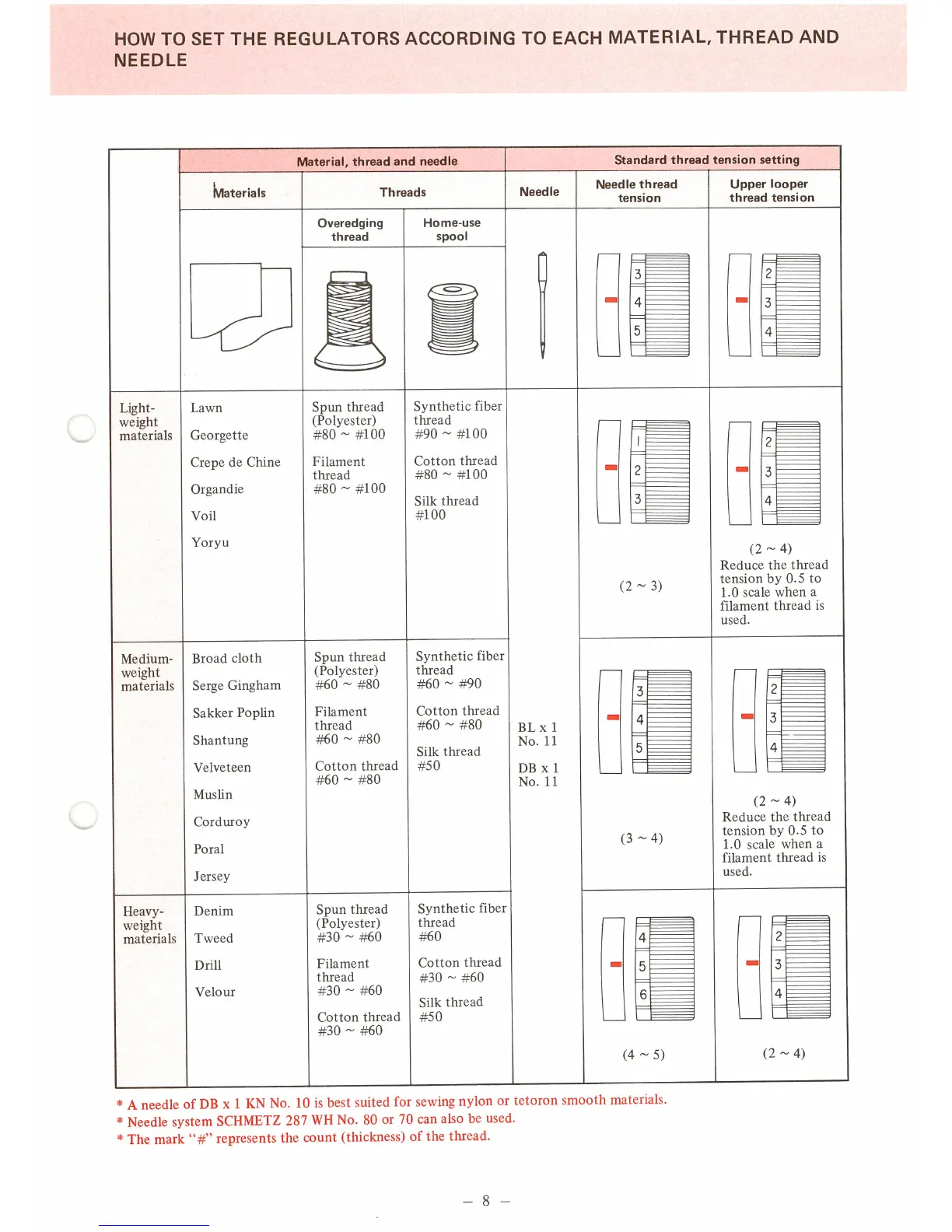 JUKI MO-103N - Setting Regulators by Material, Thread, and Needle