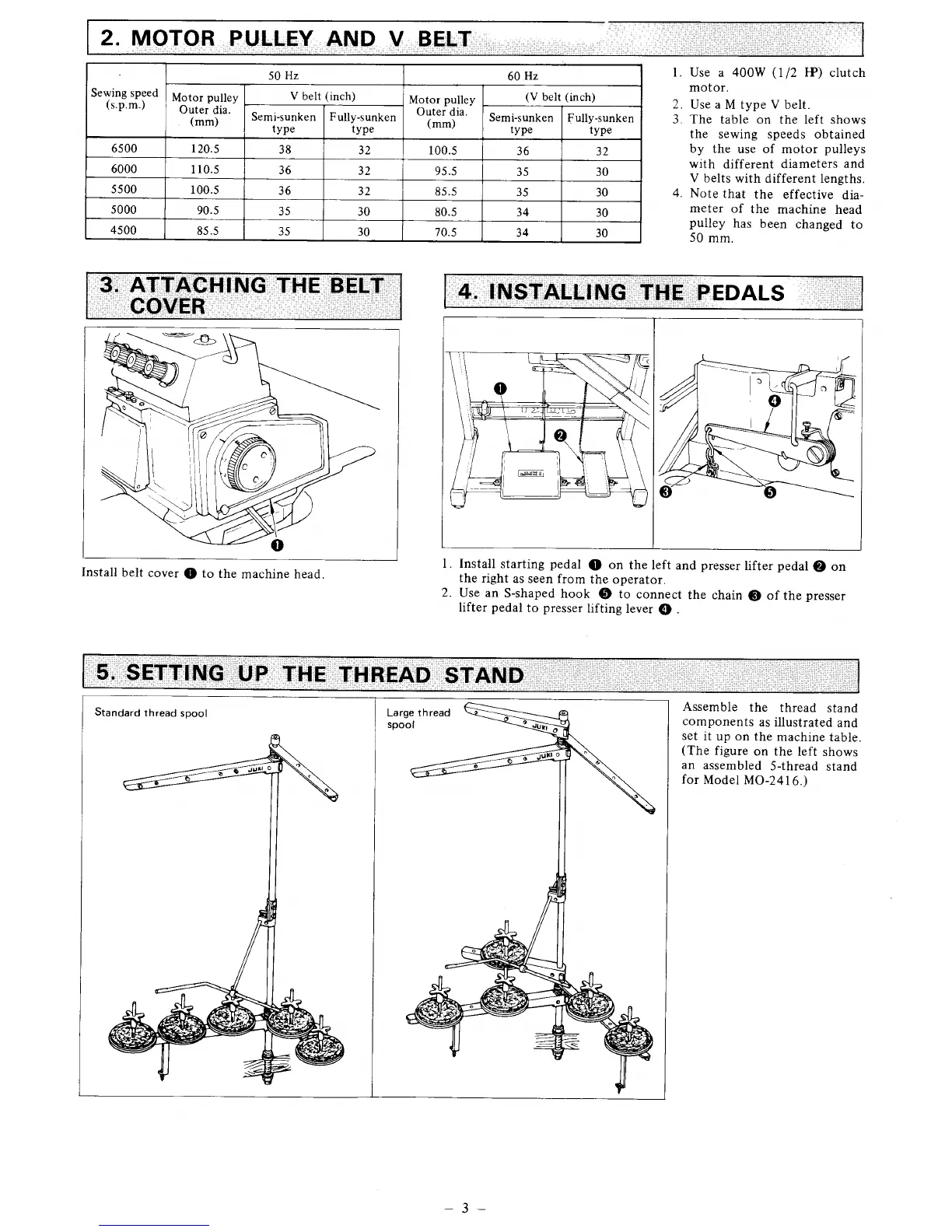 JUKI MO-2414 - Motor Pulley and V Belt; Attaching the Belt Cover; Setting up the Thread Stand; Inst Alling T He Pedals