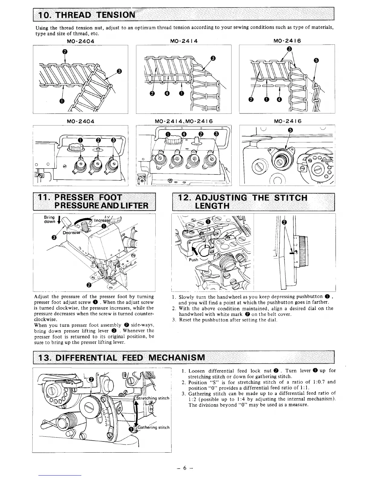 JUKI MO-2414 - Thread Tension Adjustment; Presser Foot Pressure and Lifter; Stitch Length Adjustment; Differential Feed Mechanism