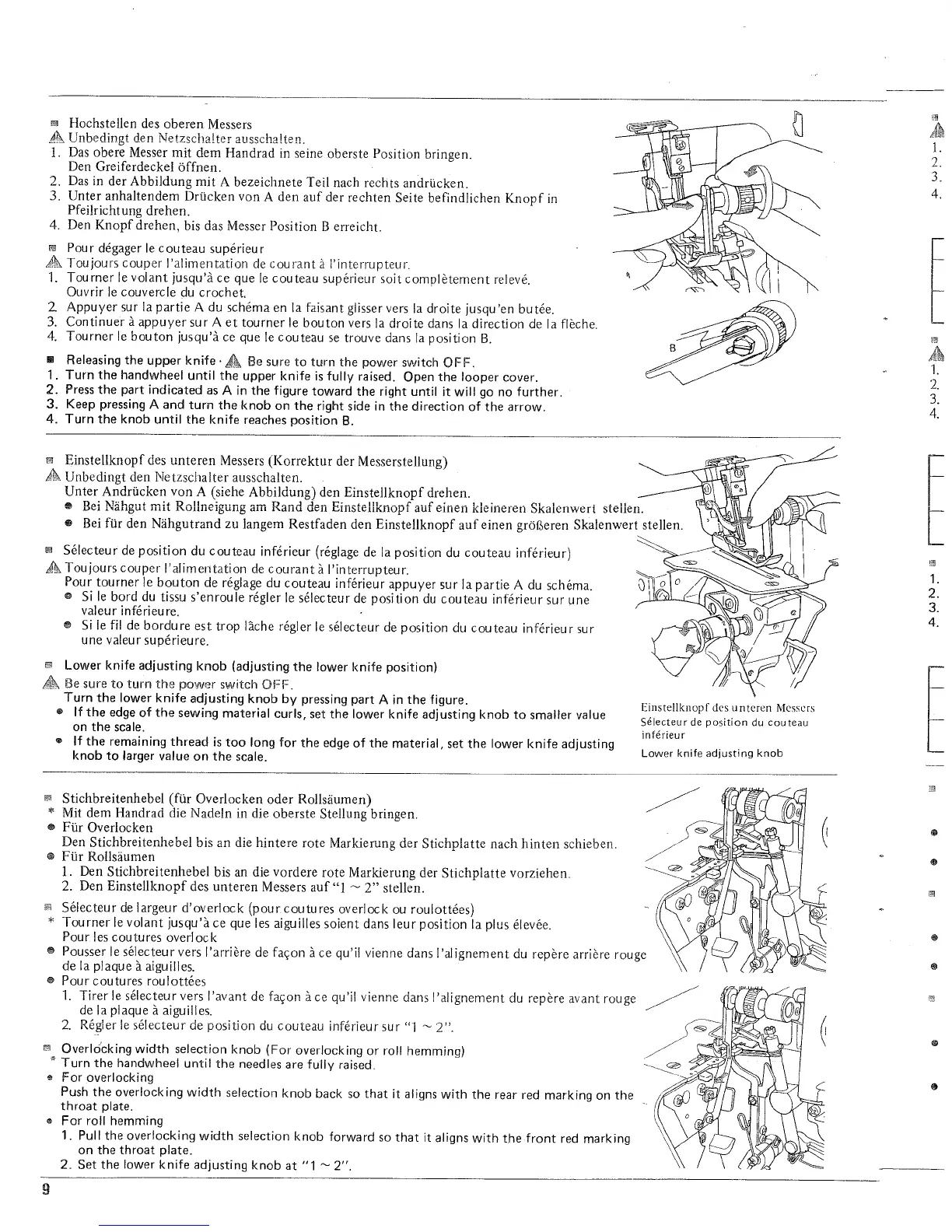 JUKI MO-634 - Releasing the Upper Knife; Lower Knife Adjusting Knob; Overlocking Width Selection Knob