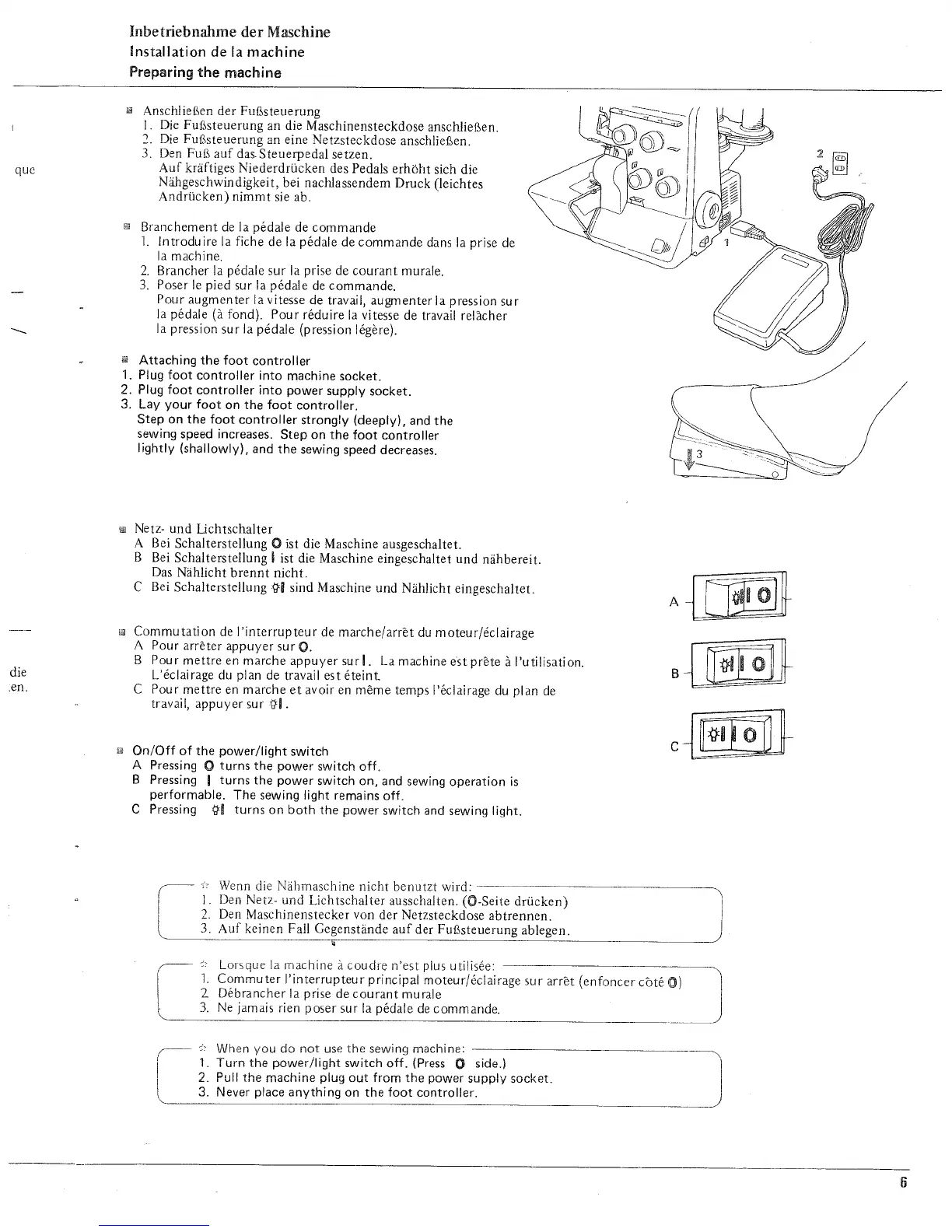 JUKI MO-634 - Attaching the Foot Controller; On;Off of the Power;Light Switch; When You Do Not Use the Sewing Machine