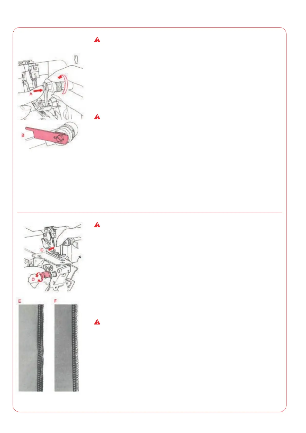• (E): If the edge of the sewing materialcurls, set the lower knife adjusting knob (D) to smaller