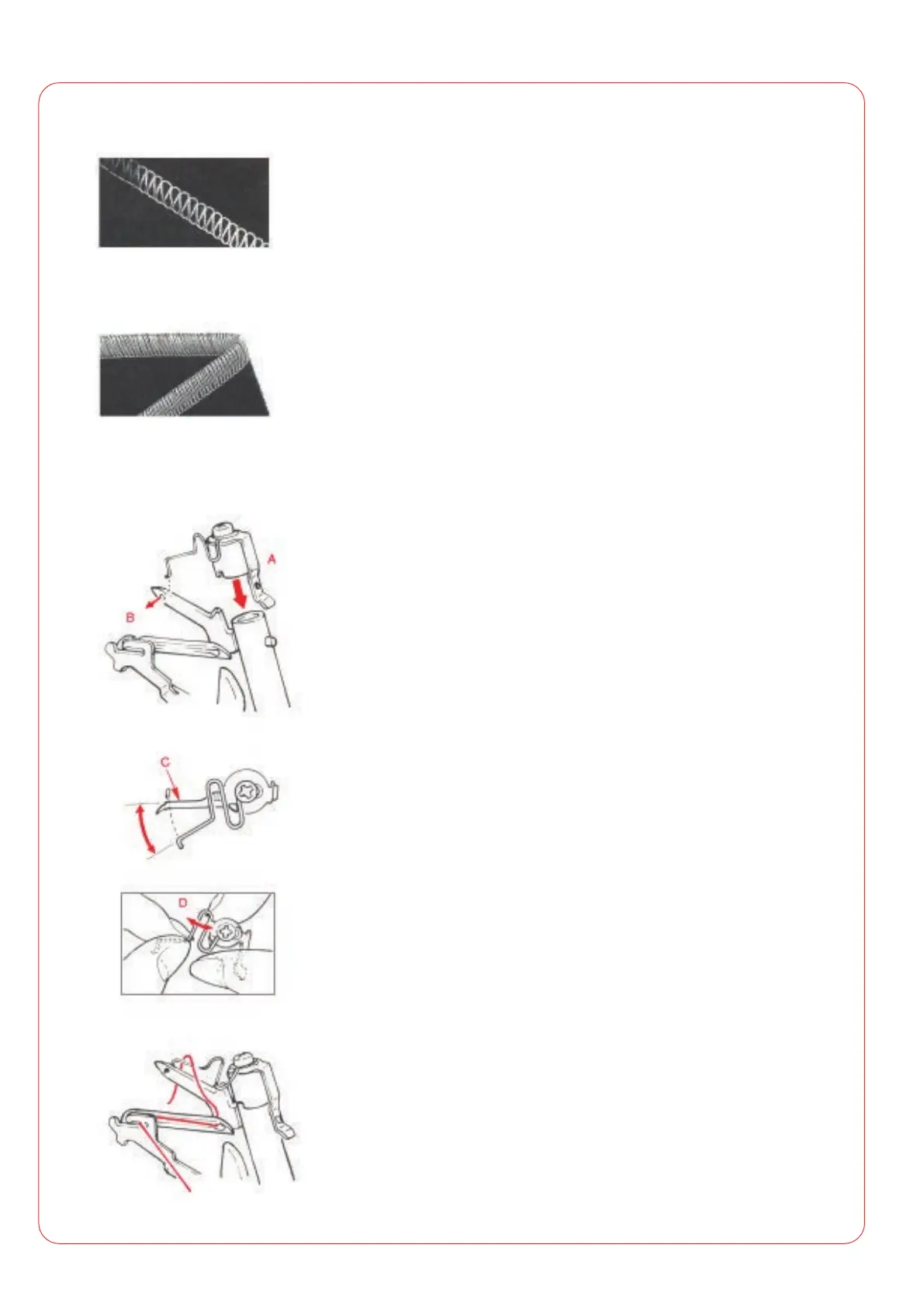 Upper looper (C): Press the springy wire backward until its top end fits in the hole in the