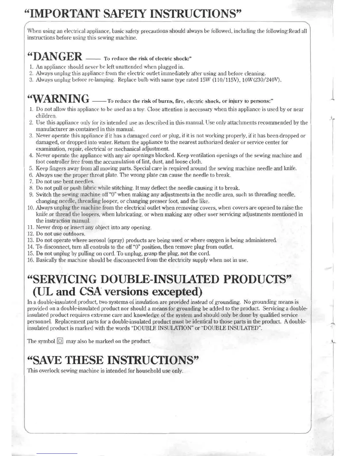 JUKI MO-654DE/654 - Important Safety Instructions; DANGER - Electric Shock Risk; WARNING - Personal Injury Risk