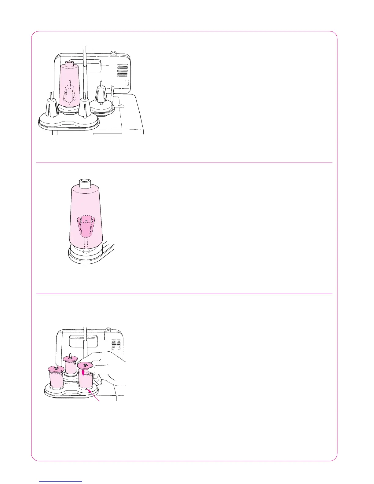 Infilare le spoline direttamente sui perni, fissarle poi con i dischi svolgi filo, messi