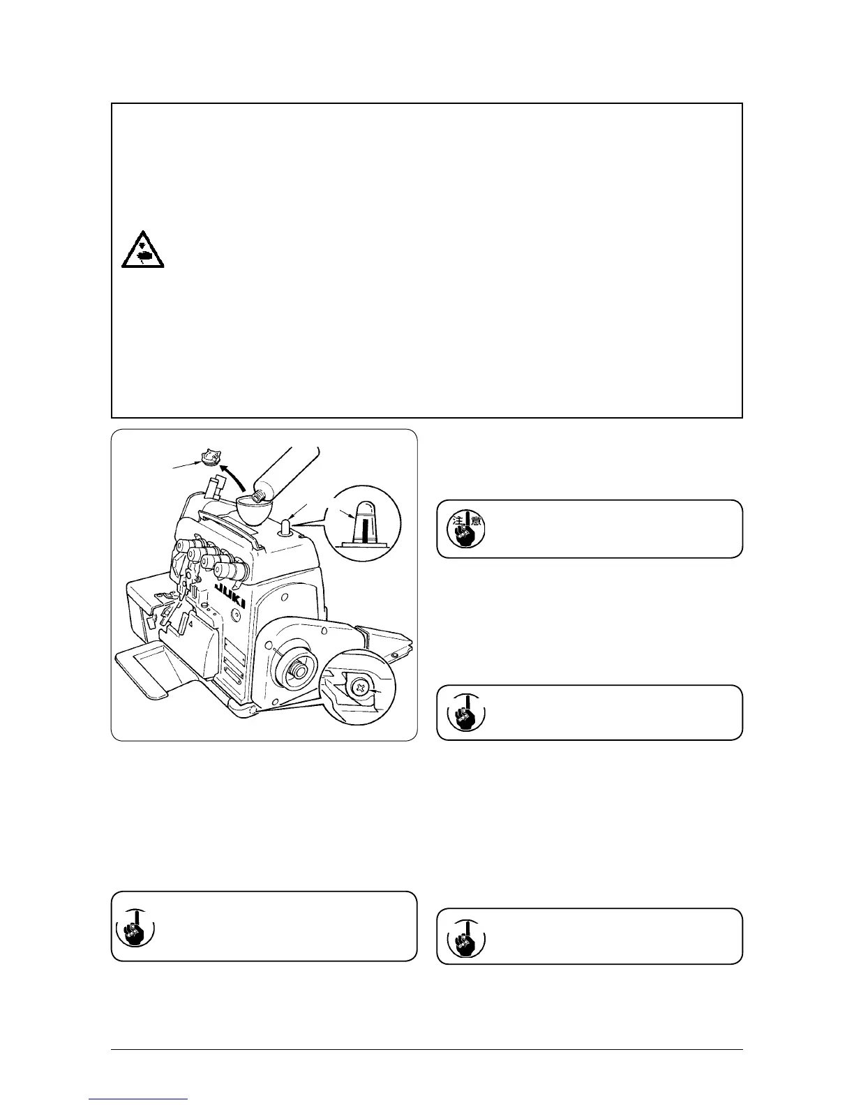 ミシンの不意の起動による人身の損傷を防ぐため、電源を切り、モータの回転が止まったことを確認してから行なってください。
