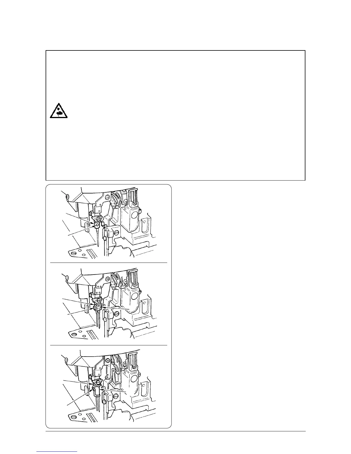 ミシンの不意の起動による人身の損傷を防ぐため、電源を切り、モータの回転が止まったことを確認してから行なってください。
