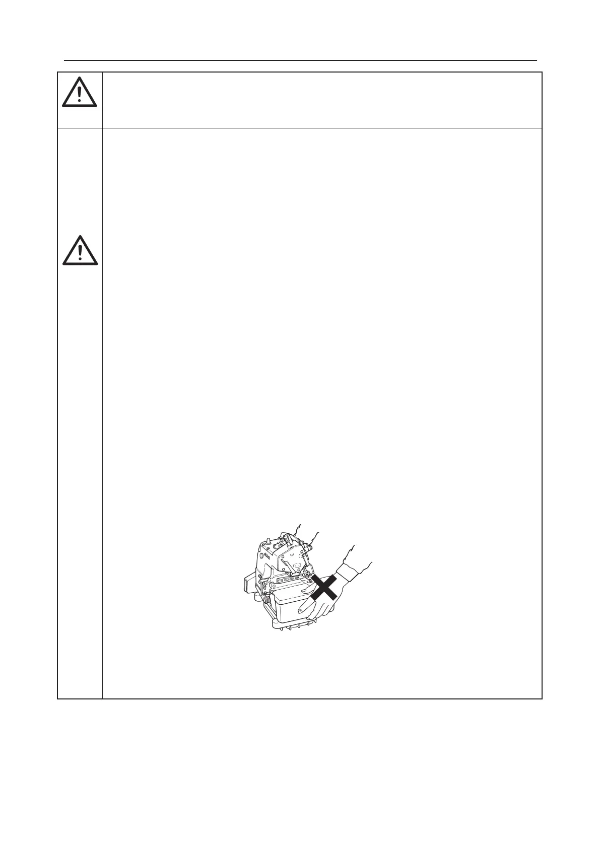 12. 为了防止缝纫机落下造成人身事故,搬运缝纫机时请不要手拿布台护罩。拿布台护罩后