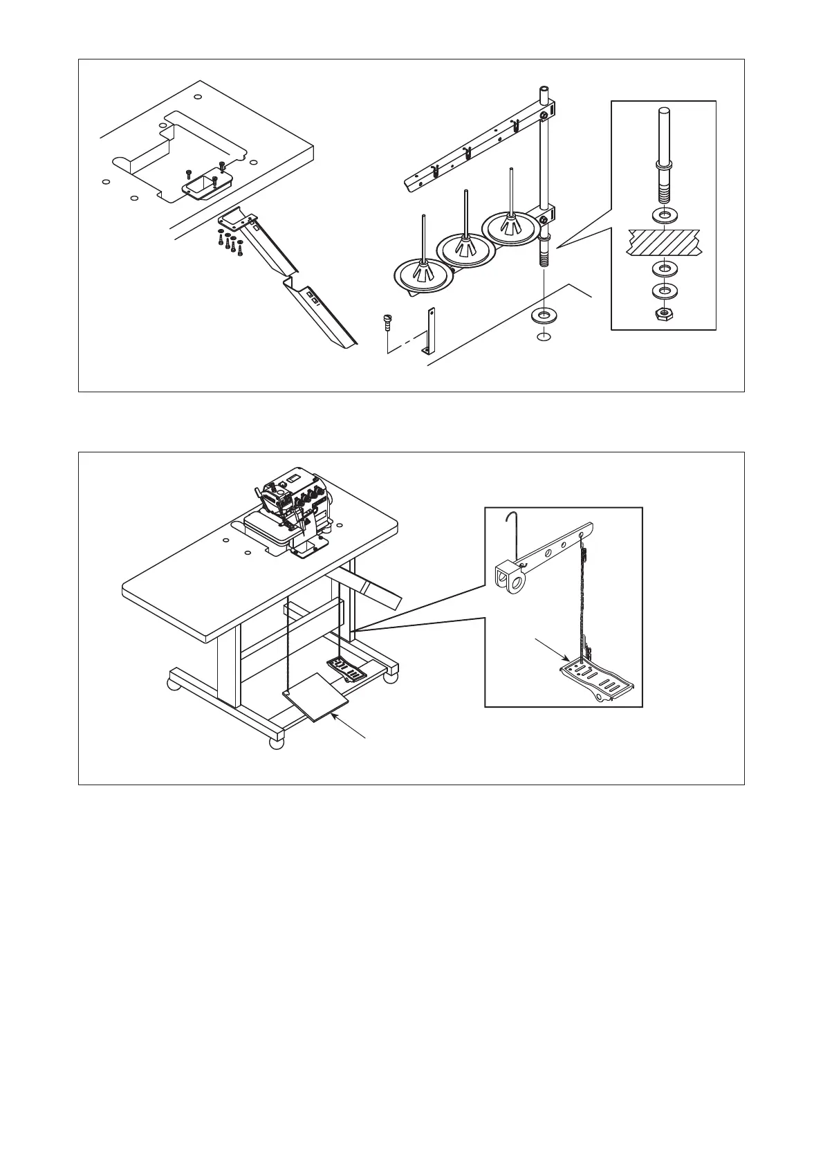 3) Assemble the motor starting pedal to the left side, and the presser foot pedal to the right side.