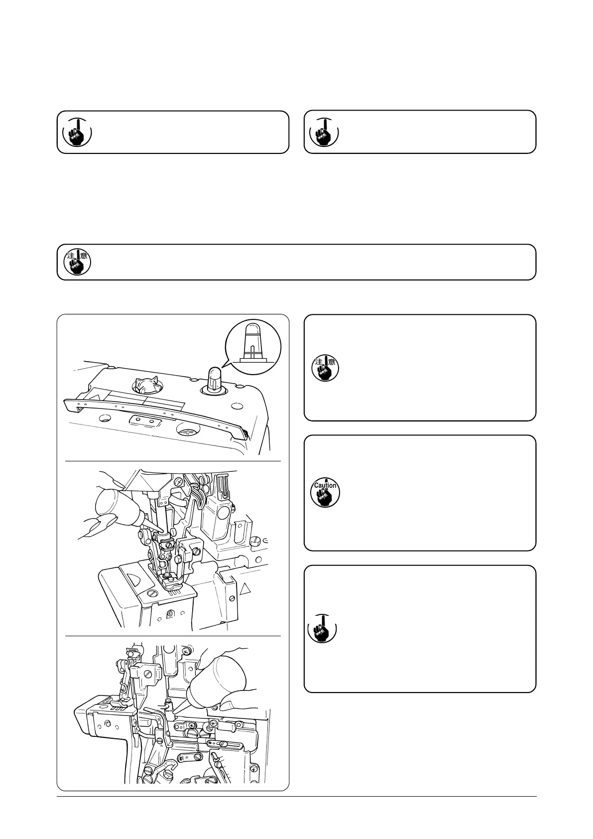 ミシンの不意の起動による人身の損傷を防ぐため、電源を切り、モータの回転が止まったことを確認してから行なってください。