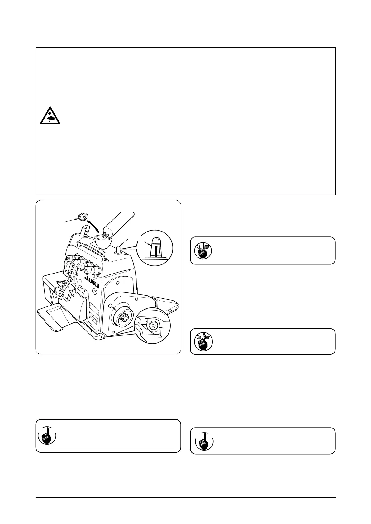 ミシンの不意の起動による人身の損傷を防ぐため、電源を切り、モータの回転が止まったことを確認してから行なってください。