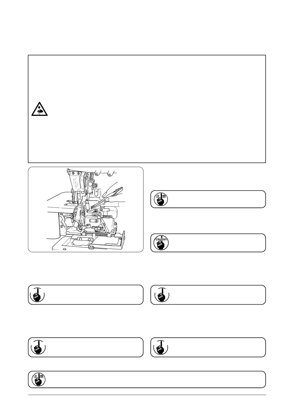 ミシンの不意の起動による人身の損傷を防ぐため、電源を切り、モータの回転が止まったことを確認してから行なってください。