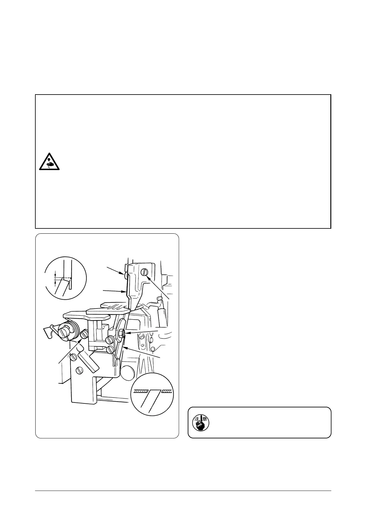 ミシンの不意の起動による人身の損傷を防ぐため、電源を切り、モータの回転が止まったことを確認してから行なってください。