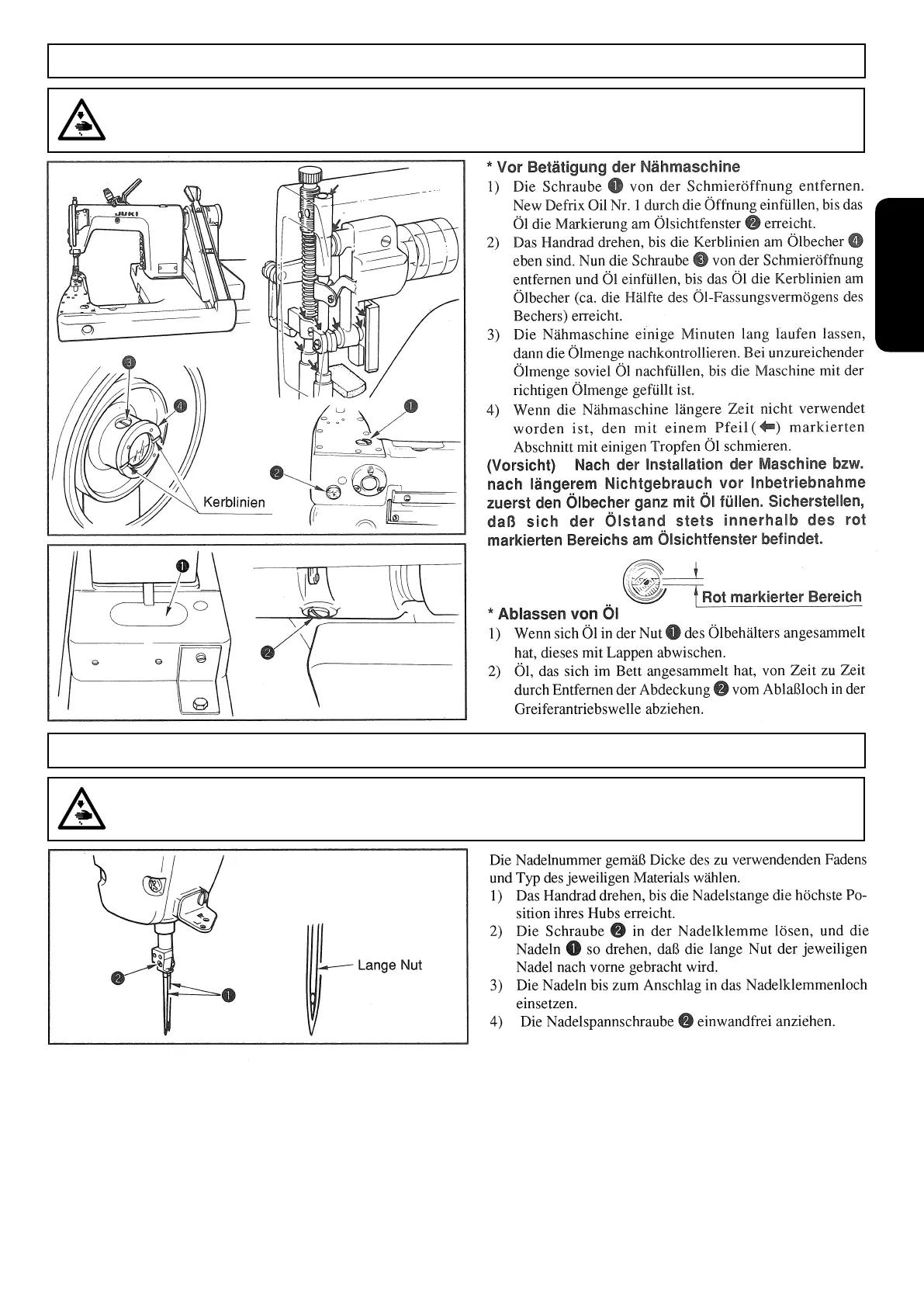Um durch plötzliches Anlaufen der Nähmaschine verursachte Verletzungen zu vermeiden, führen Sie die folgende Arbeit