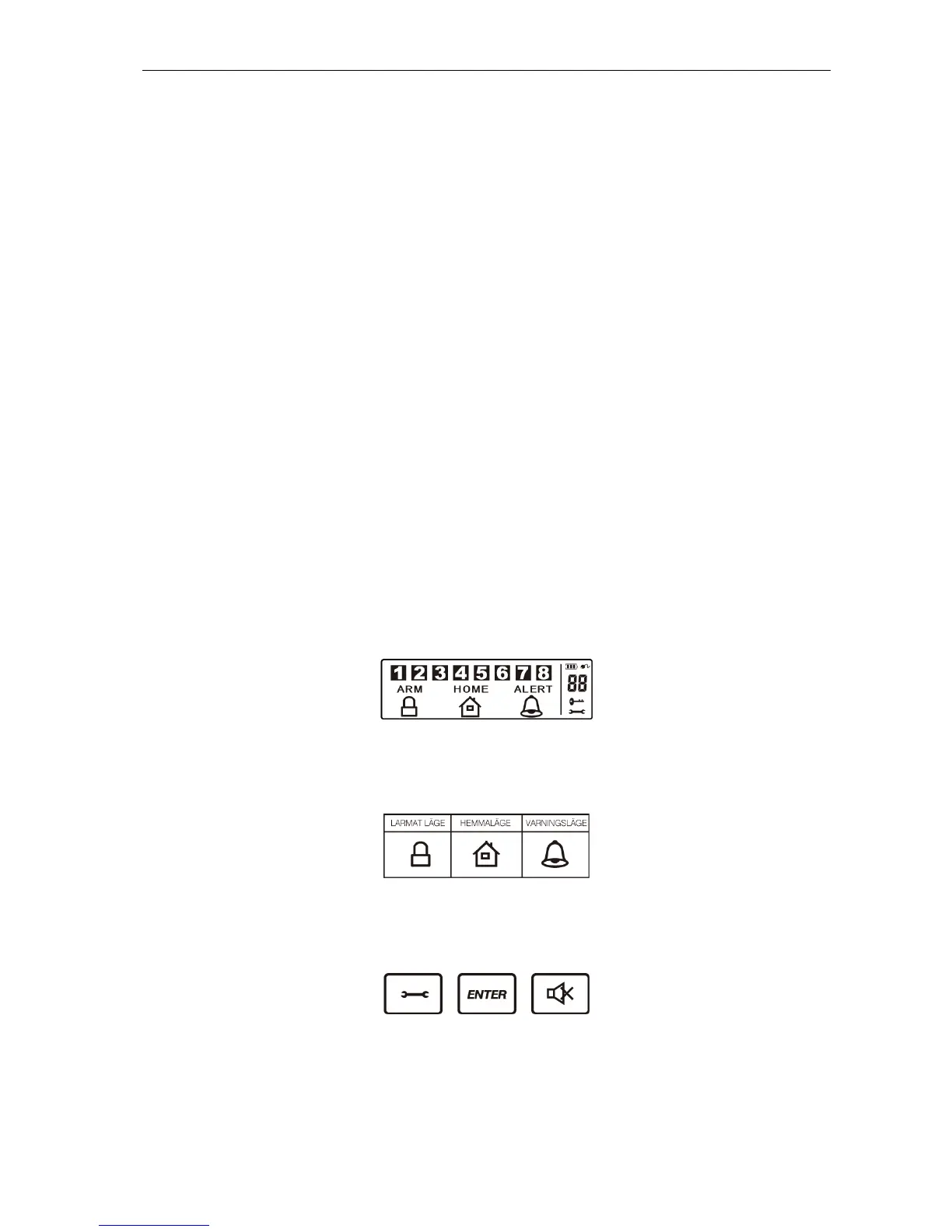ARM (LARMAT LÄGE) HOME (HEMMALÄGE) ALERT (VARNINGSLÄGE)