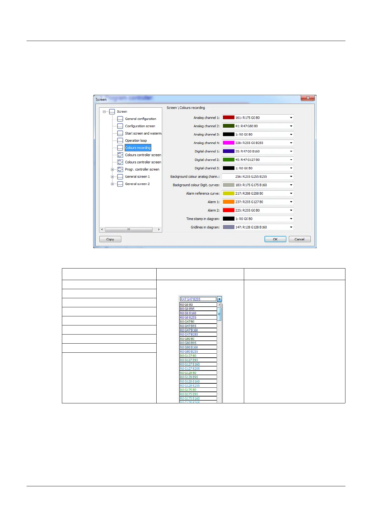 The colors for the channels and alarms displayed can be set using this function.