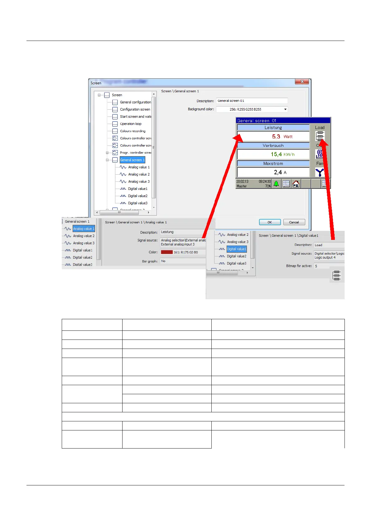 Description Analog value 1 to 3 Text for analog value 1 to 3 (in light-blue box)