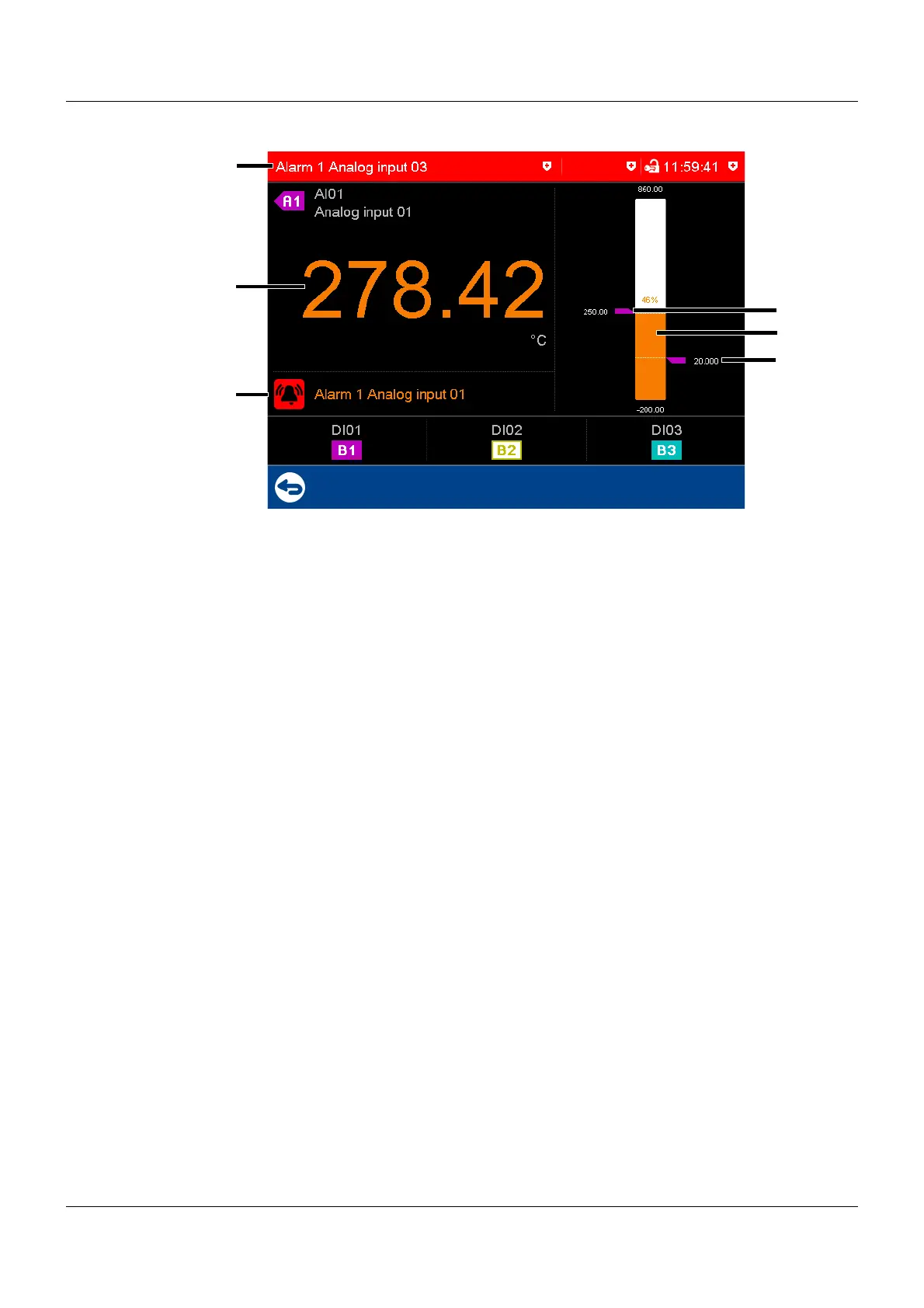 (3) Alarm text of analog input (6) Limit value for min. alarm (configurable)