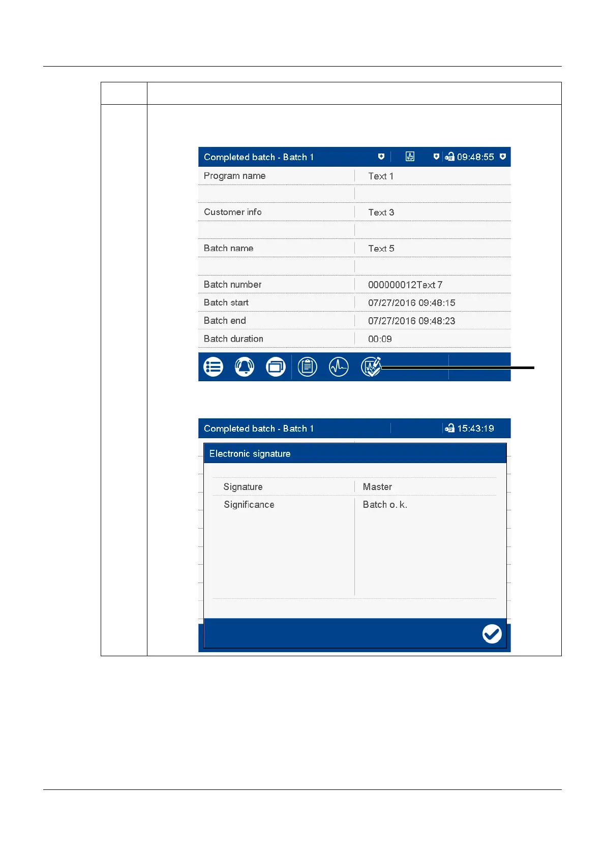 The signature (here: Master) and the meaning of the signature (here: Batch o.k.) are dis-