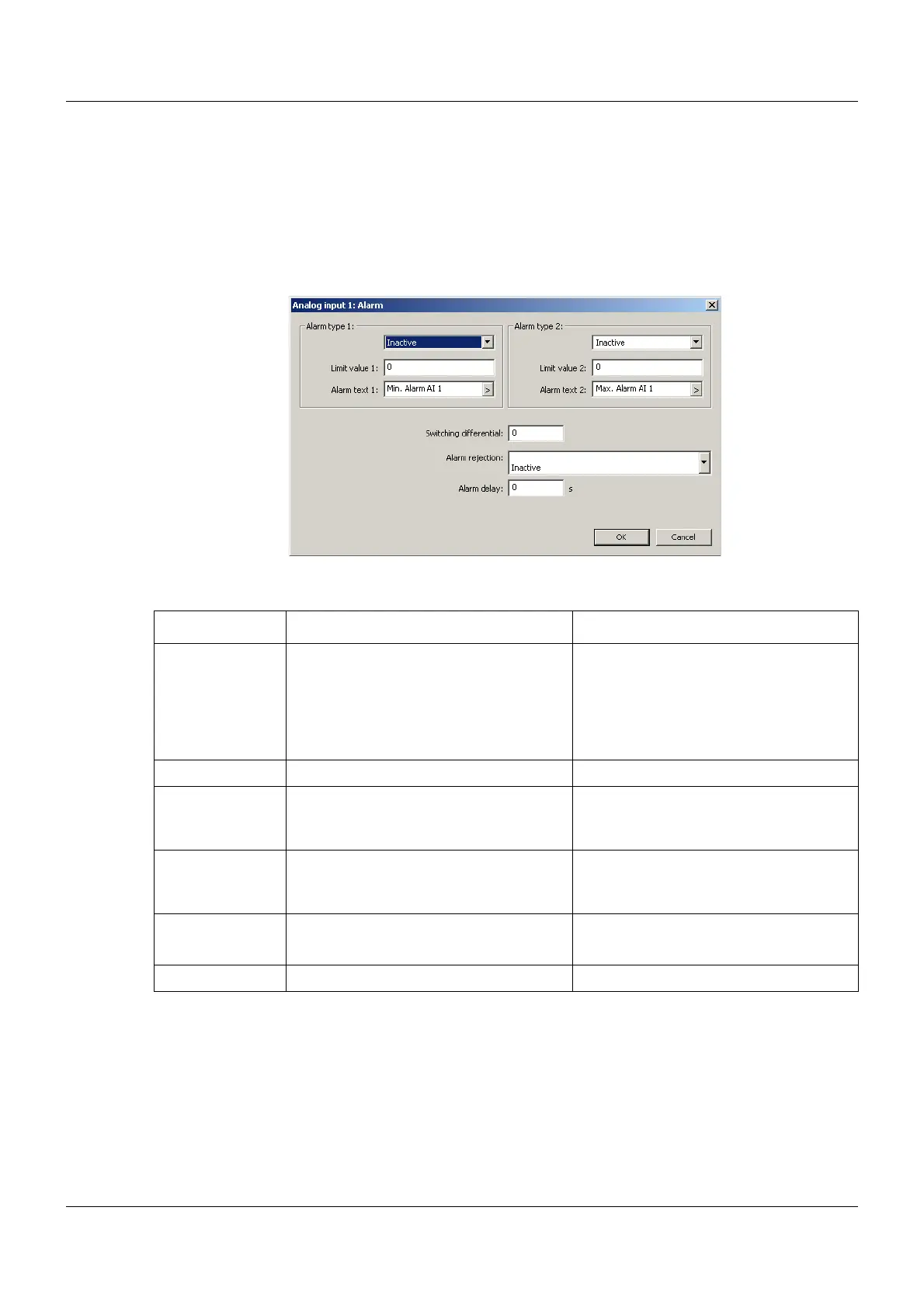 Limit value monitoring with one or two alarms can be activated for each analog input. The alarm