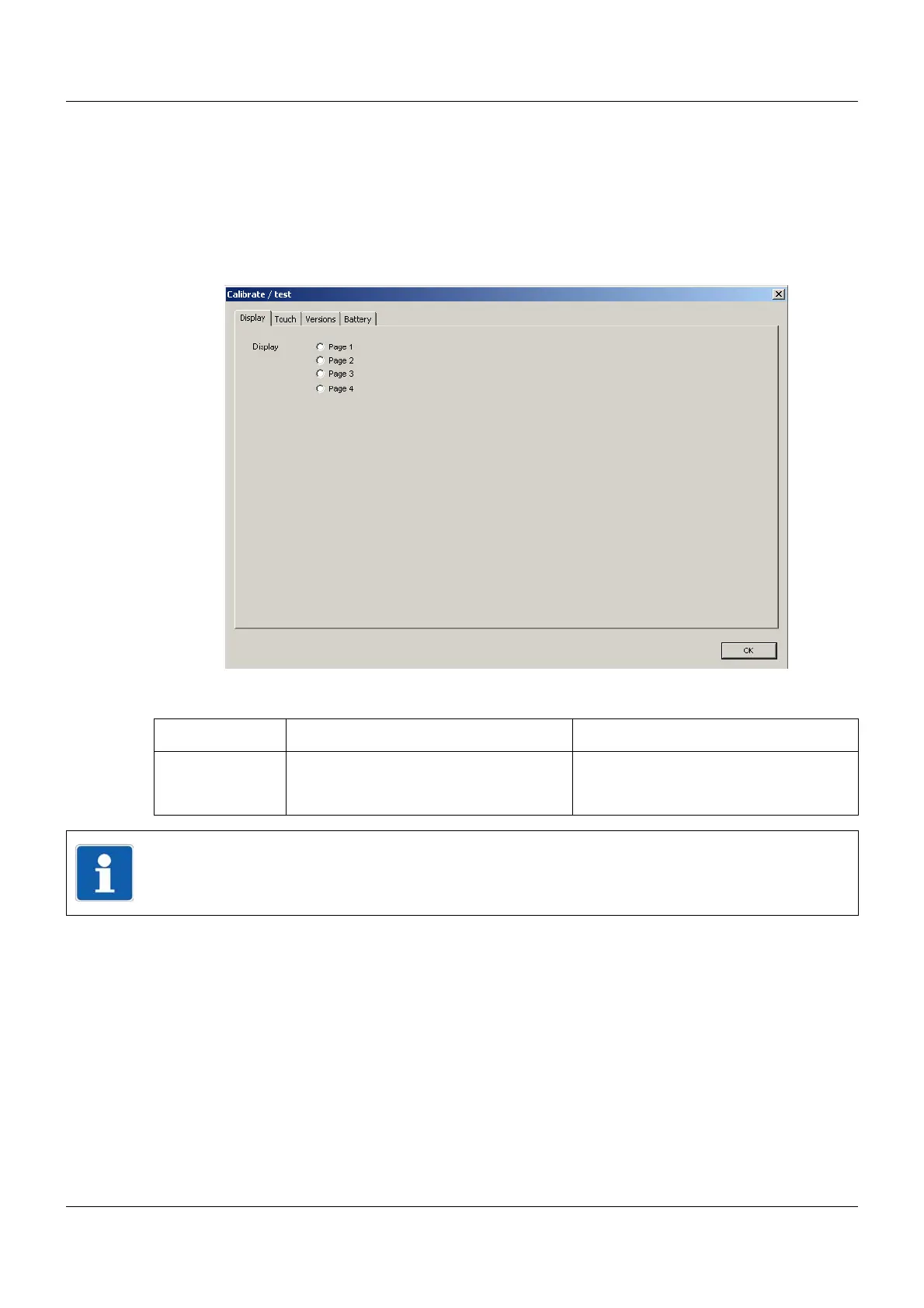The screen remains in this test mode until the "Calibrate / test" dialog is exited by touching