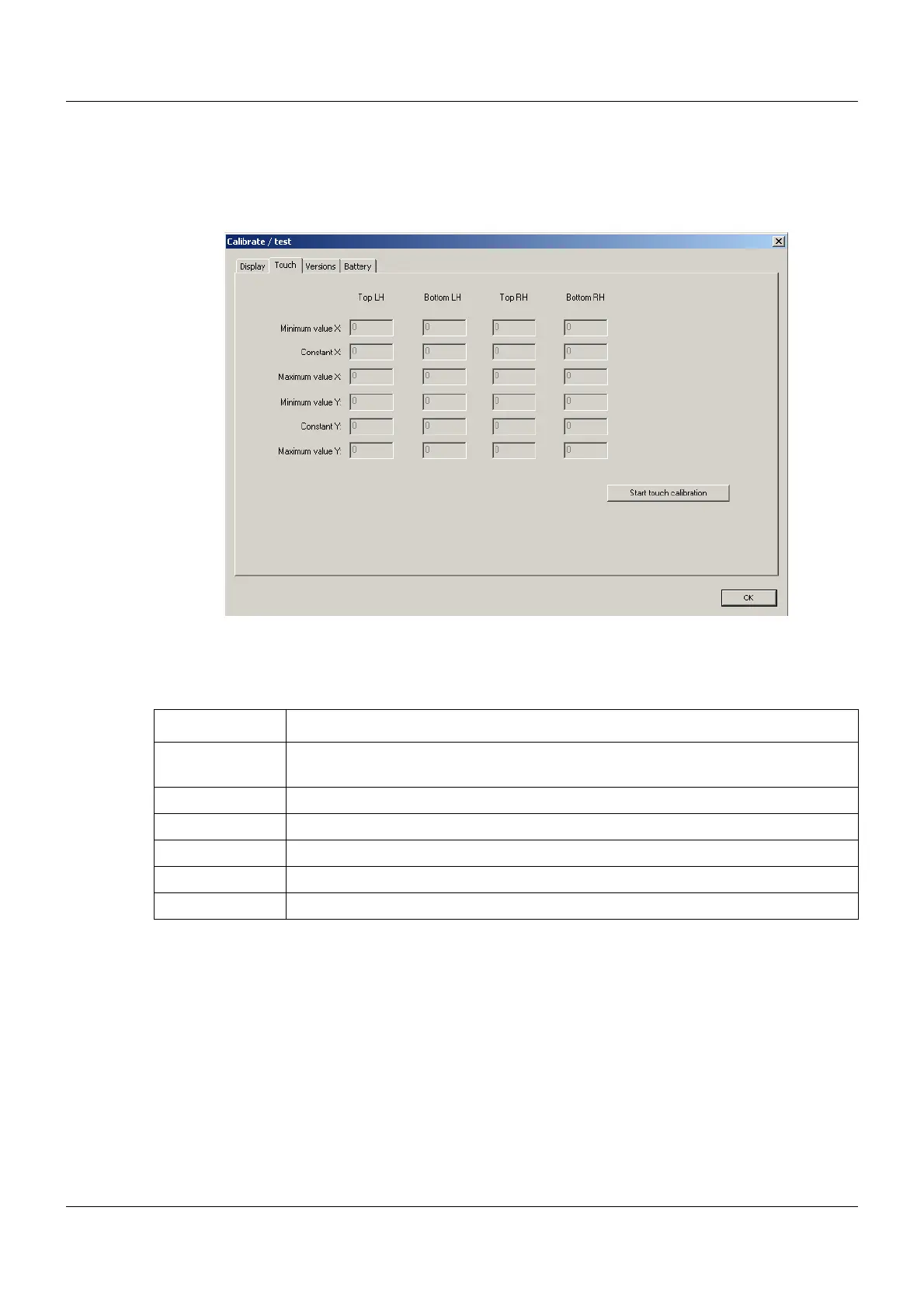 The touch function of the screen is calibrated in this dialog.