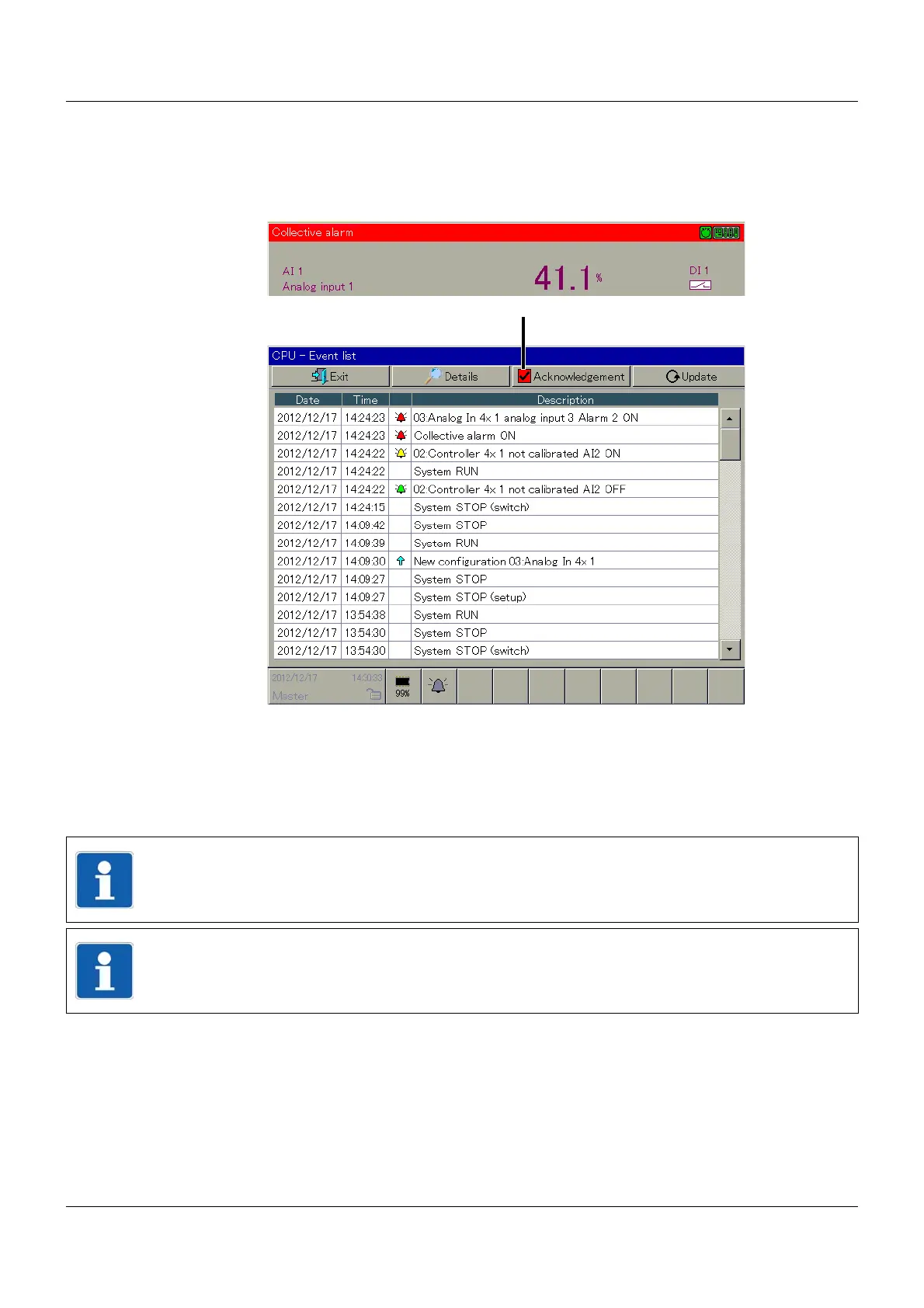 With this function, the user must acknowledge an alarm within the alarm list. Until the alarm has