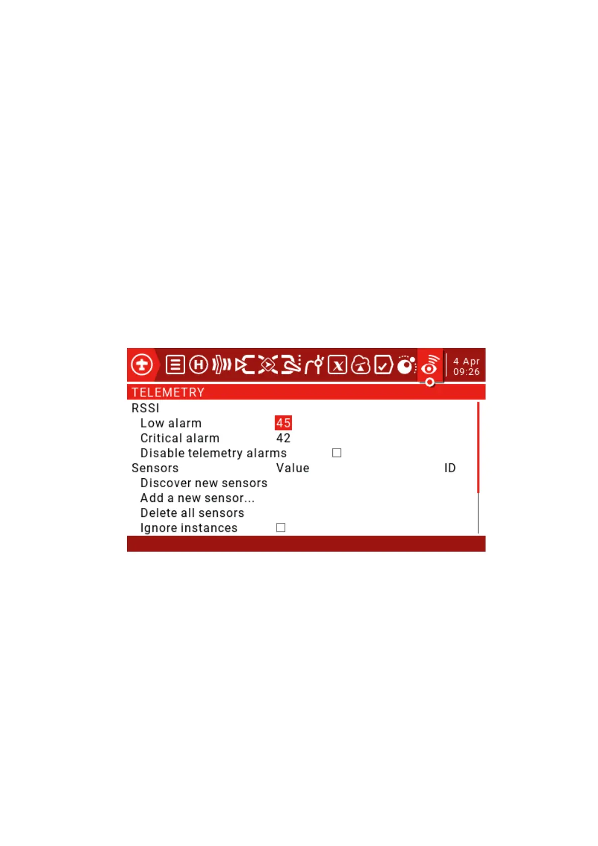 model to the remote control, indicating the strength of the received signal. Warnings can be set