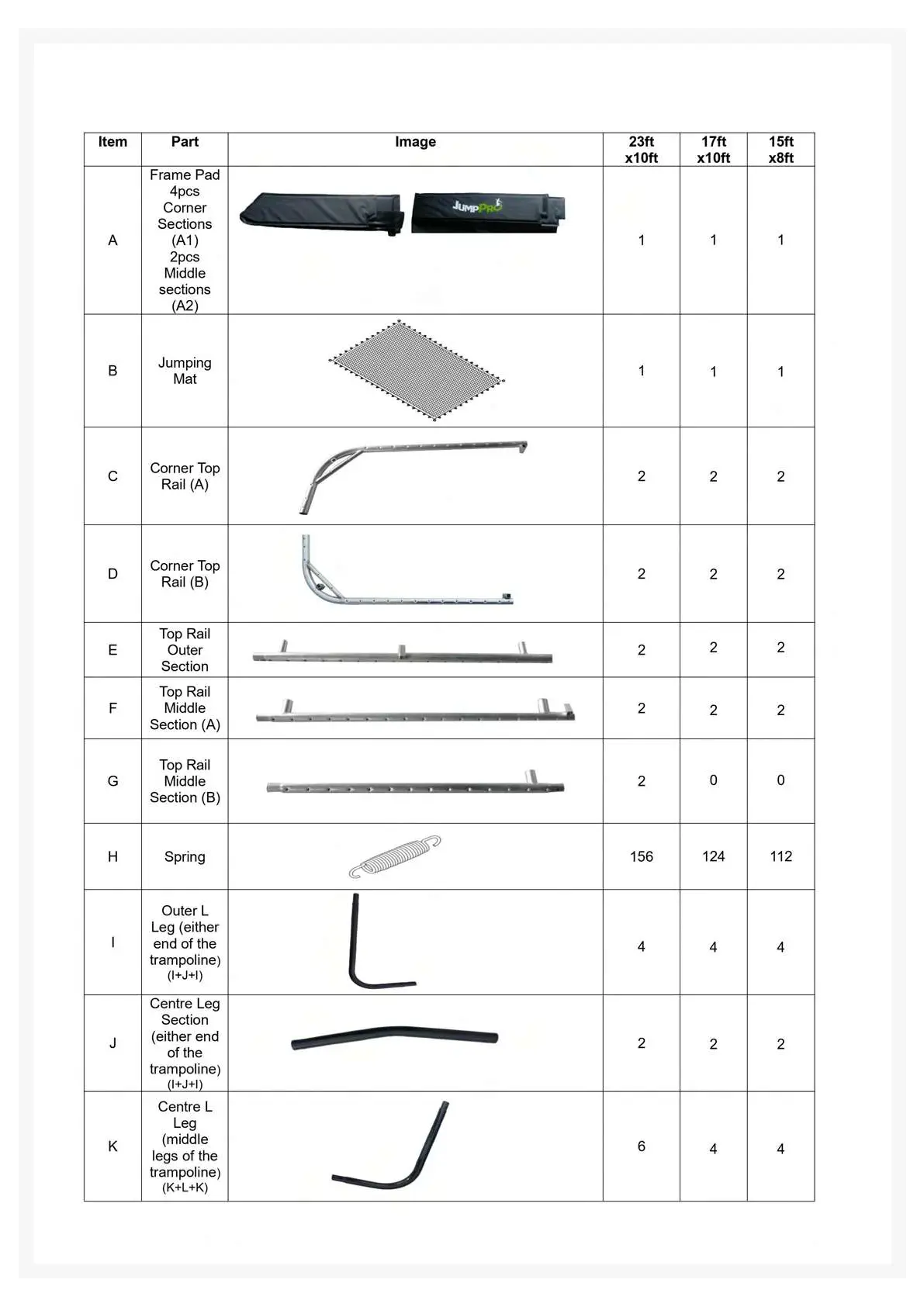 JumpPro Xtra - Trampoline Parts List