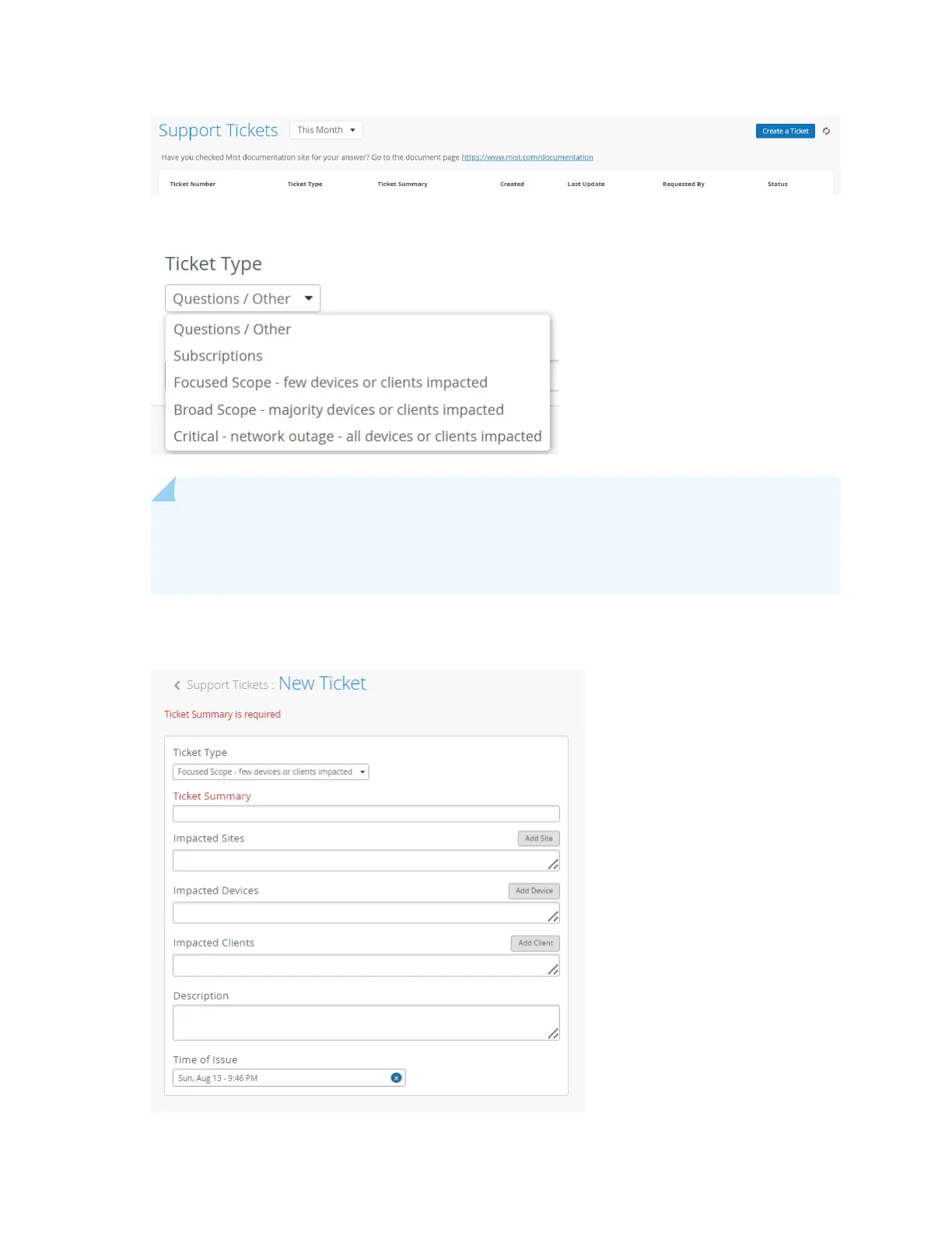 5. Enter a cket summary, and select the sites, devices, or clients that are impacted.